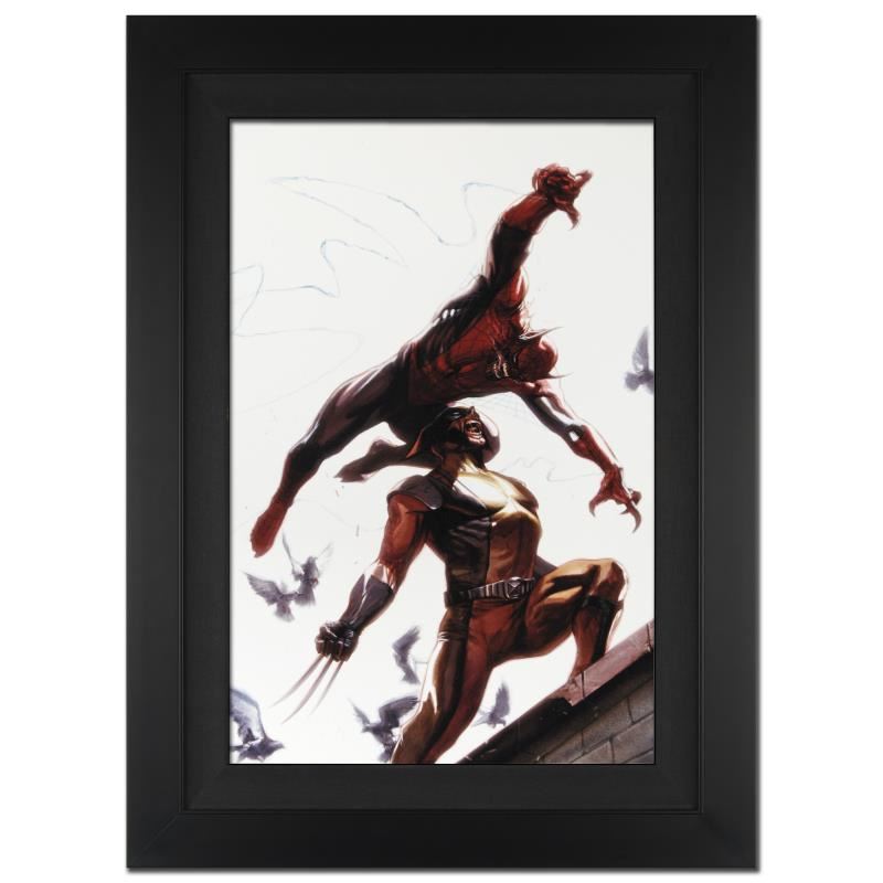 A piece of comic book history, this limited edition, from original art by Gabriele Dell'Otto, depicts Wolverine and Spider-Man as Vampires. In 1998 Dell'Otto started collaborating with the European division of Marvel Comics, producing covers, posters and lithographies for Italy, France and Germany. In 2002, his work was shown to the editor-in-chief of Marvel Comics, who entrusted to him with the art for the Secret War mini-series. "Secret Invasion #7" is an extremely limited edition giclee on canvas by Gabriele Dell'Otto presented by Marvel Comics, hand signed by the great Stan Lee and numbered out of only 10! This piece is custom framed and ready to hang. Includes Certificate of Authenticity! Measures approx. 25" x 34" (with frame), 18" x 27" (image).