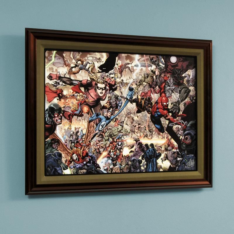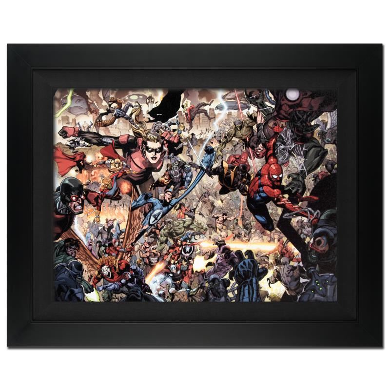 A piece of comic book history, this limited edition, from original art by Leinil Francis Yu, depicts classic characters such as Spider-Man, Ronin, Stature, Mr. Fantastic, and many others. After winning the Wizard's Drawing Board Contest, Marvel Comics hired Leinil Francis Yu to work on the Wolverine series. After his run on Wolverine, he moved on to work on Marvel's core X-Men title in 2000. Yu continued to work on other Marvel titles such as Fantastic Four, Ultimate Wolverine vs. Hulk and New Avengers. "Secret Invasion #7" is an extremely limited edition numbered giclee on canvas by Leinil Francis Yu presented by Marvel Comics, hand signed by the great Stan Lee and numbered out of only 4! This piece is custom framed and ready to hang. Includes Certificate of Authenticity! Measure approx. 36" x 29" (with frame), 29" x 22" (image).