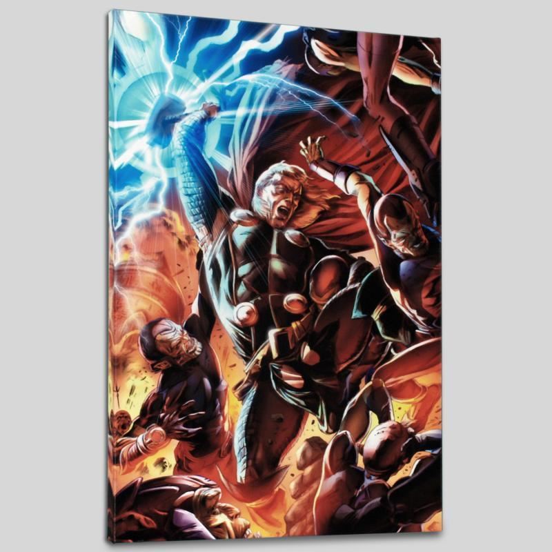 A piece of comic book history, this limited edition, from original art by Doug Braithwaite, depicts a mighty Thor. Doug Braithwaite started out working on British comics, like 2000 AD and A1, but is best known for his Marvel Comics work on the Earth X sequels, Universe X and Paradise X, as well as The Punisher Kills, the Marvel Universe, and Punisher: MAX. "Secret Invasion: Thor #2" is a limited edition giclee on canvas by Doug Braithwaite presented by Marvel Comics! This piece comes gallery wrapped. Includes Certificate of Authenticity! Measures approx. 18" x 27" (image).