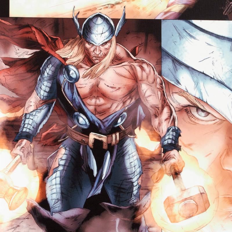 A piece of comic book history, this limited edition, from original art by Doug Braithwaite, depicts an epic Thor and his hammer Mjulner. Doug Braithwaite started out working on British comics, like 2000 AD and A1, but is best known for his Marvel Comics work on the Earth X sequels, Universe X and Paradise X, as well as The Punisher Kills, the Marvel Universe, and Punisher: MAX. "Secret Invasion: Thor #3" is a limited edition giclee on canvas by Doug Braithwaite presented by Marvel Comics, numbered and hand signed by the great Stan Lee! Includes Certificate of Authenticity! Measures approx. 18" x 27" (image).