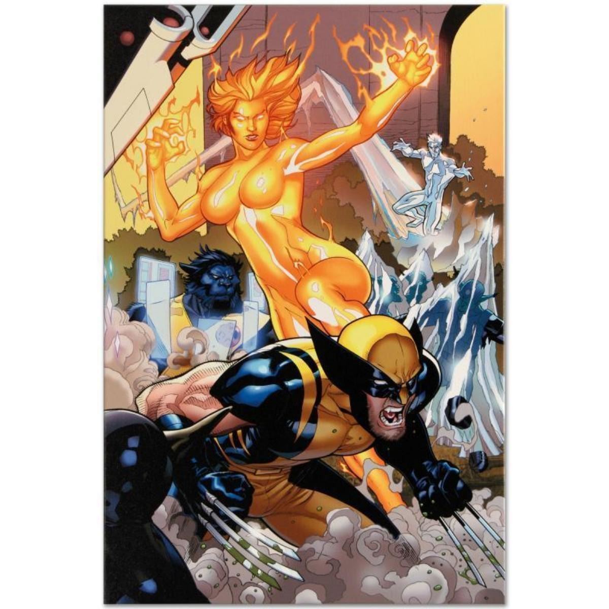 A piece of comic book history, this limited edition, from original art by Terry Dodson, depicts the classic characters Wolverine, Silver Surfer and Magma. Known primarily for his work on the X-Men franchise, Terry Dodson has also contributed to the Spider-Man franchise, particularly in the "Marvel Knights Spider-Man" mini series. "Secret Invasion: X-Men #4" is a limited edition giclee on canvas by Terry Dodson presented by Marvel Comics. This piece comes gallery wrapped. Includes Certificate of Authenticity! Measures approx. 18" x 27" (image).