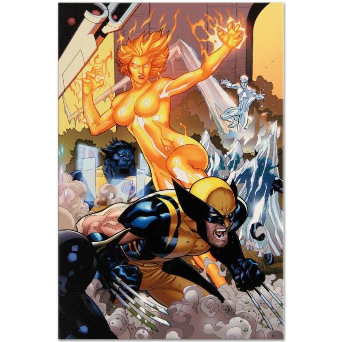 A piece of comic book history, this limited edition, from original art by Terry Dodson, depicts the classic characters Wolverine, Silver Surfer and Magma. Known primarily for his work on the X-Men franchise, Terry Dodson has also contributed to the Spider-Man franchise, particularly in the "Marvel Knights Spider-Man" mini series. "Secret Invasion: X-Men #4" is a limited edition giclee on canvas by Terry Dodson presented by Marvel Comics. This piece comes gallery wrapped. Includes Certificate of Authenticity! Measures approx. 18" x 27" (image). This item requires special handling and may have a longer than usual turnaround.