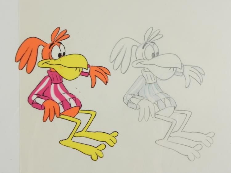 My lips are sealed, your secret is safe with me... * Original * Cel and Drawing * * AnimationOriginal "rough" drawing * in black and * non-photo blue pencil with the notations in black and non-photo * blueOverall size is a 12-field * drawing that is 10 * 1/2" x 12 1/2"Size of cel: 10 1/2" x * 12 * 1/2"Overall condition: Cel- Very good; paint residue to Sonny's body & Drawing- Excellent * This is an * original * hand-painted cel used in the production of * the "Coco Puffs" TV commercial. Each cel represents a * slight * change in position of the characters. When individually photographed and * projected in rapid succession, the images appear to move.To * create production cels, the original animator's drawing is transferred * onto an acetate cel (by hand-inking and/or photo copying). The cel is * then hand-painted on the reverse * side. * * * The drawing and cel are ready to be matted and * framed. The animator's notations are located at the bottom of both. *