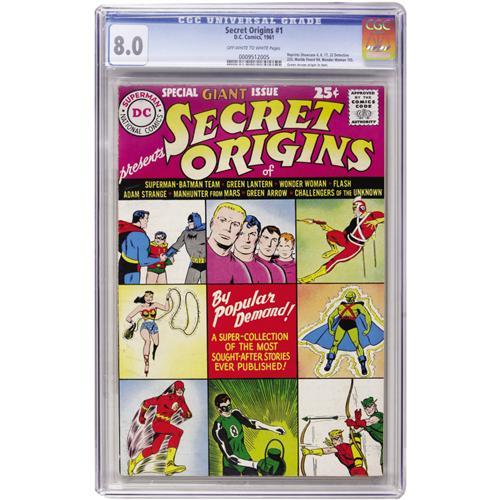 <B>Secret Origins #1 (DC, 1961) CGC VF 8.0 Off-white to white pages.</B></I> This one-shot featured origin stories of The Flash, Challengers of the Unknown, Adam Strange, and Green Lantern (from <B>Showcase</B></I> #4, 6, 17, and 22), the Superman and Batman team (<B>World's Finest Comics </B></I>#94), J'onn J'onzz (<B>Detective Comics </B></I>#225), and Wonder Woman (<B>Wonder Woman </B></I>#105). Overstreet 2006 VF 8.0 value = $392. CGC census 3/07: 4 in 8.0, 11 higher. <I> From the Janowicz Collection.</B></I><BR><BR><b>Shipping:</b> Comics - Slabbed (certified) (<a target="_blank" href="http://www.heritageauctions.com/common/shipping.php">view shipping information</a>)