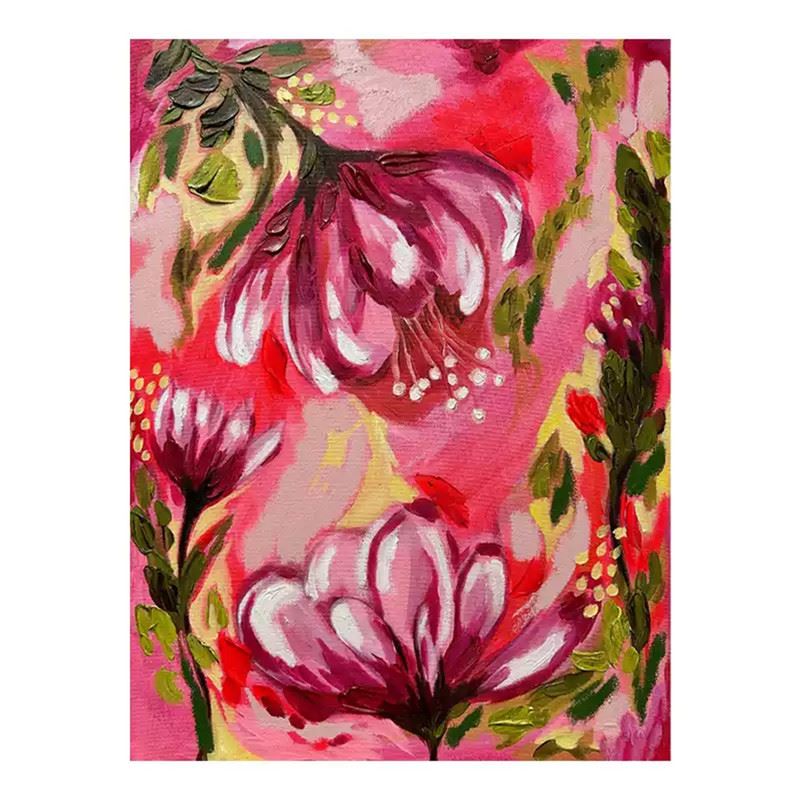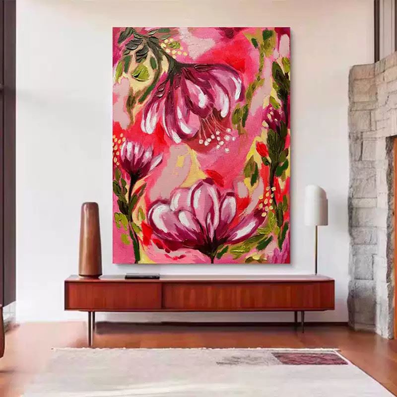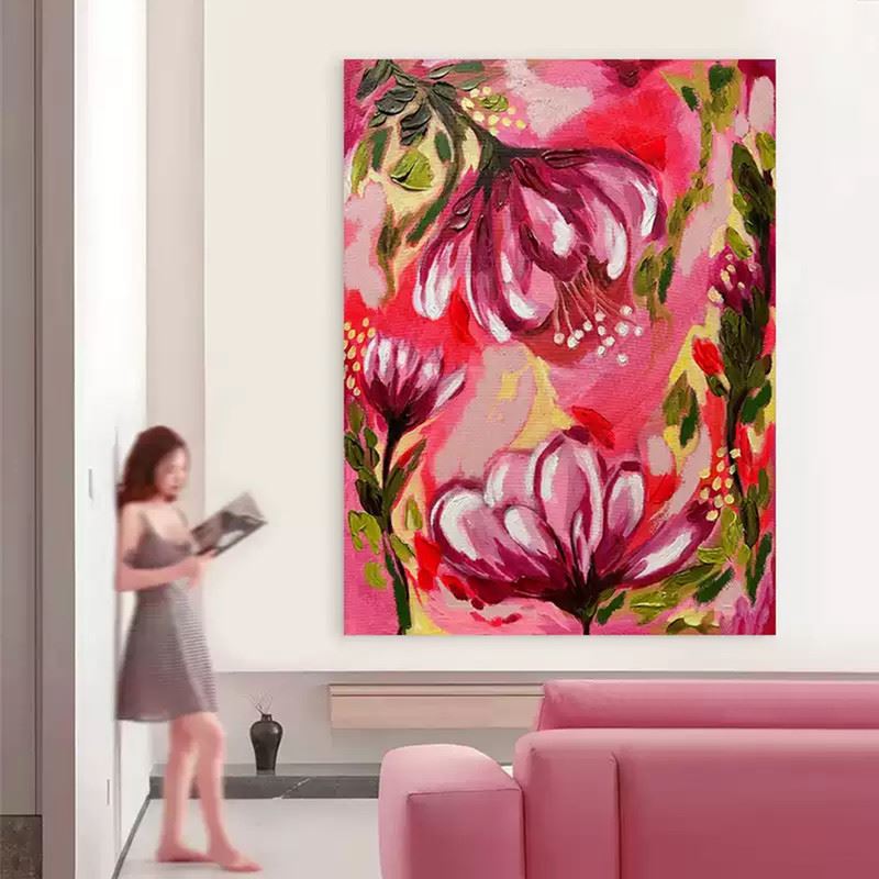 Crimson and rose-pink spread into a passionate floral realm, petals overlapping like soft whispers, as if guarding a secret story of fragrance. Dimensions: 24 x 31 inches.