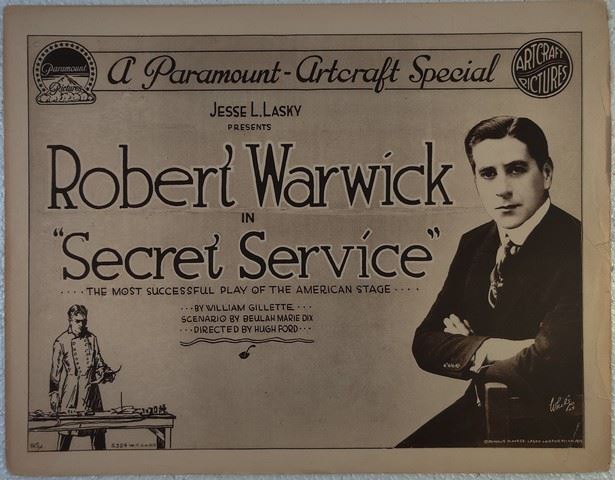 Secret Service (Paramount Pictures, Artcraft Pictures, Jesse L. Lasky; 1919) lobby card. Drama. Starring Robert Warwick, Wanda Hawley, Raymond Hatton, Guy Oliver, Irving Cummings. Directed by Hugh Ford. Creases, tears, edge wear, tape. Very Good. (11"x14").