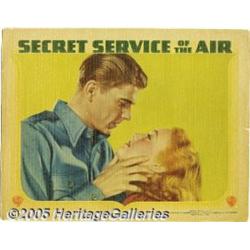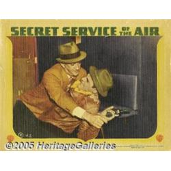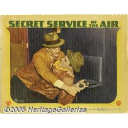 <B>Secret Service of the Air (Warner Brothers, 1938)</B></I> Lobby Cards (2) (11" X 14"). A Secret Service agent has been killed because he knew about a smuggling ring bringing in illegal aliens from Mexico. Now they have to call in Brass Bancroft! Ronald Reagan plays the ex-Navy pilot who is recruited to infiltrate the gang of smugglers. The other lesser card has John Litel struggling for a gun. The Reagan card has pinholes, edge wear, a very slight border stain, and the toning associated with Warner Brothers linen stock. Fine/Very Fine. The fight card pinholes, edge wear and tears, a small chip on the upper edge, and the toning that naturally comes with Warner Brothers linen stock. Fine-. 2 items