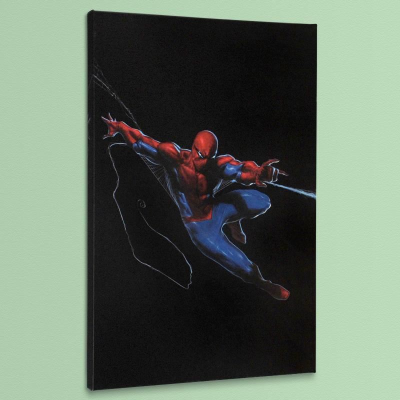 A piece of comic book history, this limited edition, from original art by Gabriele Dell'Otto, depicts an Action packed Iron Man Scene. In 1998 Dell'Otto started collaborating with the European division of Marvel Comics, producing covers, posters and lithographies for Italy, France and Germany. In 2002, his work was shown to the editor-in-chief of Marvel Comics, who entrusted to him with the art for the Secret War mini-series. "Secret War #1" is a limited edition numbered giclee on stretched canvas by Gabriele Dell'Otto presented by Marvel Comics. This piece comes gallery wrapped. Includes Certificate of Authenticity! Measure approx. 18" x 27" (image); approx. 1.5" (depth).
