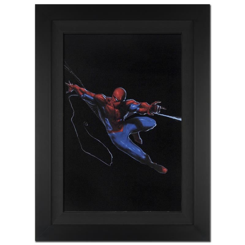 A piece of comic book history, this limited edition, from original art by Gabriele Dell'Otto, depicts a classic Spider-Man. In 1998 Dell'Otto started collaborating with the European division of Marvel Comics, producing covers, posters and lithographies for Italy, France and Germany. In 2002, his work was shown to the editor-in-chief of Marvel Comics, who entrusted to him with the art for the Secret War mini-series. "Secret War #1" is an extremely limited edition giclee on canvas by Gabriele Dell'Otto presented by Marvel Comics, hand signed by the great Stan Lee and numbered out of only 4! This piece comes custom framed and ready to hang. Includes Certificate of Authenticity! Measures approx. 29" x 40" (with frame), 22" x 33" (image).