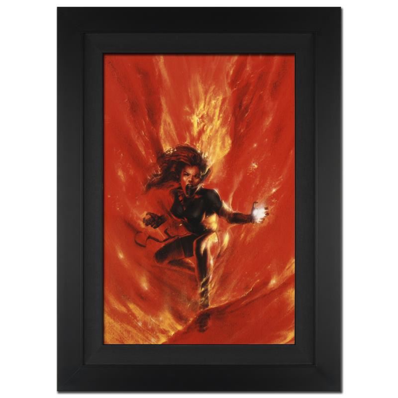 A piece of comic book history, this limited edition, from original art by Gabriele Dell'Otto, depicts Phoenix in a fiery blaze. In 1998 Dell'Otto started collaborating with the European division of Marvel Comics, producing covers, posters and lithographies for Italy, France and Germany. In 2002, his work was shown to the editor-in-chief of Marvel Comics, who entrusted to him with the art for the Secret War mini-series. "Secret War #1" is a limited edition giclee on canvas by Gabriele Dell'Otto presented by Marvel Comics, hand signed by the Great Stan Lee (1922-2018) and numbered out of only 4! This piece has been custom framed and ready to hang. Includes Certificate of Authenticity! Measures approx. 29" x 40" (with frame) 22" x 33" (image).