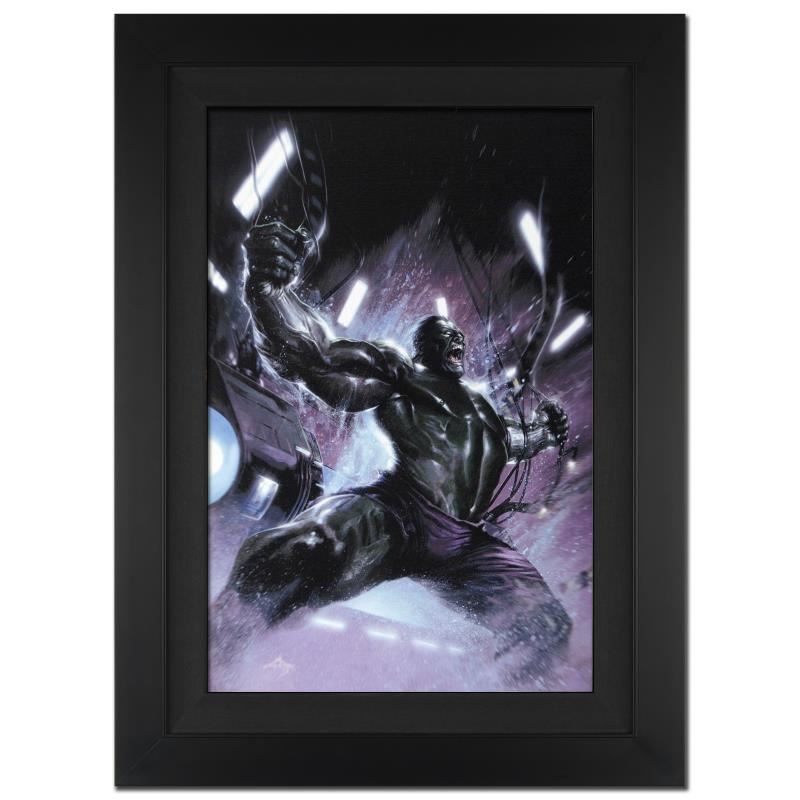 A piece of comic book history, this limited edition, from original art by Gabriele Dell'Otto, depicts an enraged Hulk. In 1998 Dell'Otto started collaborating with the European division of Marvel Comics, producing covers, posters and lithographies for Italy, France and Germany. In 2002, his work was shown to the editor-in-chief of Marvel Comics, who entrusted to him with the art for the Secret War mini-series. "Secret War #1" is an extremely limited edition giclee on canvas by Gabriele Dell'Otto presented by Marvel Comics, hand signed by the great Stan Lee and numbered out of only 10! This piece comes custom framed and ready to hang. Includes Certificate of Authenticity! Measures approx. 25" x 34" (with frame); 18" x 27" (image).