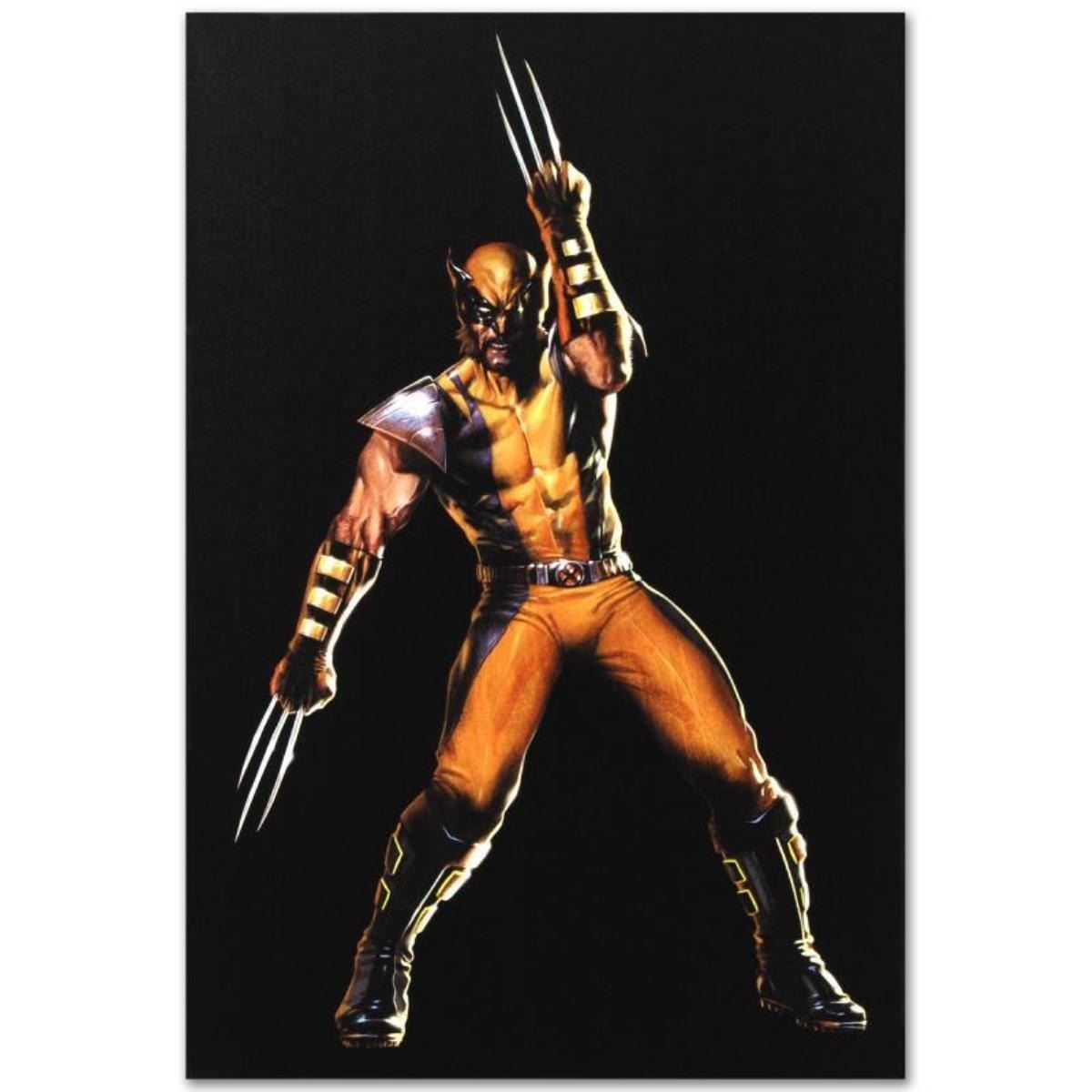 A piece of comic book history, this limited edition, from original art by Gabriele Dell'Otto, depicts heroic wild man Wolverine. In 1998 Dell'Otto started collaborating with the European division of Marvel Comics, producing covers, posters and lithographies for Italy, France and Germany. In 2002, his work was shown to the editor-in-chief of Marvel Comics, who entrusted to him with the art for the Secret War mini-series. "Secret War #2" is a limited edition numbered giclee on canvas by Gabriele Dell'Otto presented by Marvel Comics. This piece comes gallery wrapped. Includes Certificate of Authenticity! Measures approx. 18" x 27" (image); 1.5" (depth). This item requires special handling and may have a longer than usual turnaround.