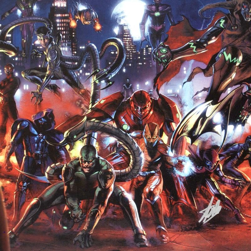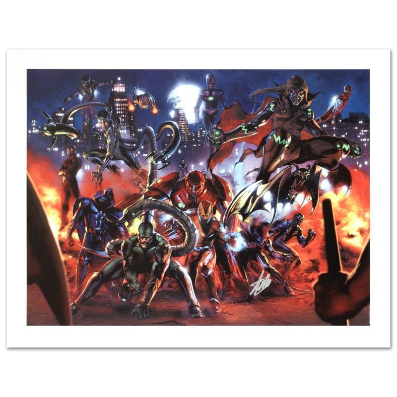 A piece of comic book history, this limited edition, from original art by Gabriele Dell'Otto, depicts Scorpion, Shocker, Hobgoblin, Doctor Octopus, and Grim Reaper. In 1998 Dell'Otto started collaborating with the European division of Marvel Comics, producing covers, posters and lithographies for Italy, France and Germany. In 2002, his work was shown to the editor-in-chief of Marvel Comics, who entrusted to him with the art for the Secret War mini-series. "Secret War #3" is a limited edition giclee on canvas by Gabriele Dell'Otto presented by Marvel Comics, numbered and hand signed by the great Stan Lee! Includes Certificate of Authenticity! Measures approx. 24" x 18" (image).