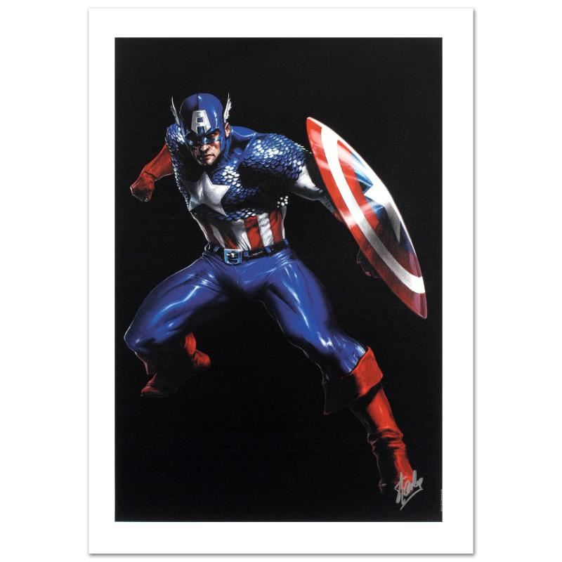 A piece of comic book history, this limited edition, from original art by Gabriele Dell'Otto, depicts the famous Captain America. Italian-born illustrator Gabriele Dell'Otto began his career with Marvel by working for the European division and created well-known covers and posters. "Secret War #3" is a limited edition giclee on canvas by Gabriele Dell'Otto presented by Marvel Comics, numbered and hand signed by the great Stan Lee! Includes Certificate of Authenticity! Measures approx. 18" x 27" (image).