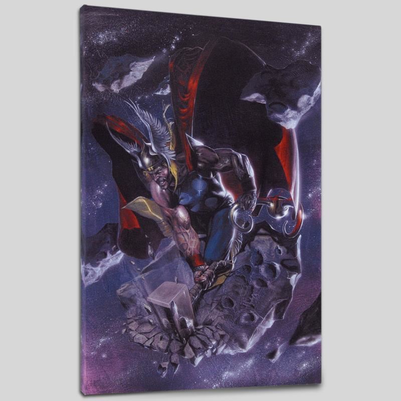 A piece of comic book history, this limited edition, from original art by Gabriele Dell'Otto, depicts an enraged Thor. In 1998 Dell'Otto started collaborating with the European division of Marvel Comics, producing covers, posters and lithographies for Italy, France and Germany. In 2002, his work was shown to the editor-in-chief of Marvel Comics, who entrusted to him with the art for the Secret War mini-series. "Secret War #4" is an extremely limited edition numbered giclee on canvas by Gabriele Dell'Otto presented by Marvel Comics. This piece comes gallery wrapped. Includes Certificate of Authenticity! Measures approx. 18" x 27" (image); 1.5" (depth).