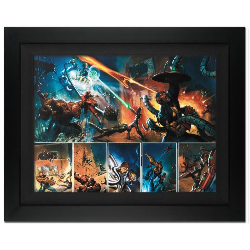 A piece of comic book history, this limited edition, from original art by Gabriele Dell'Otto, depicts an intense scene from the Fantastic Four. In 1998 Dell'Otto started collaborating with the European division of Marvel Comics, producing covers, posters and lithographies for Italy, France and Germany. In 2002, his work was shown to the editor-in-chief of Marvel Comics, who entrusted to him with the art for the Secret War mini-series. "Secret War #4" is a limited edition giclee on canvas by Gabriele Dell'Otto presented by Marvel Comics, hand signed by the great Stan Lee and numbered out of only 4! This piece has been custom framed and ready to hang. Includes Certificate of Authenticity! Measures approx. 36" x 29" (with frame); 29" x 22" (image).