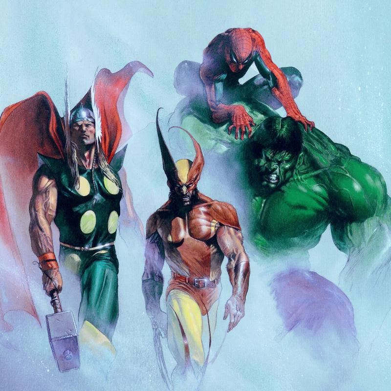 A piece of comic book history, this limited edition, from original art by Gabriele Dell'Otto, depicts Thor, Hulk Spider-Man and Wolverine. Italian-born illustrator Gabriele Dell'Otto began his career with Marvel by working for the European division and created well-known covers and posters. "Secret War VI #1" is a limited edition numbered giclee on canvas by Gabriele Dell'Otto presented by Marvel Comics. This piece comes gallery wrapped and ready to hang. Includes Certificate of Authenticity! Measure approx. 18" x 27" (image).