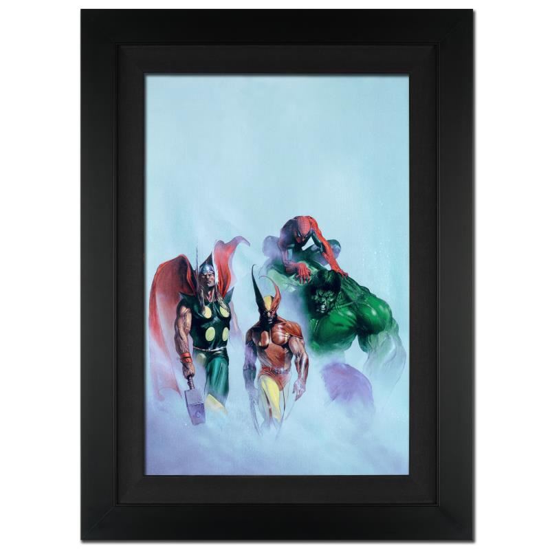 A piece of comic book history, this limited edition, from original art by Gabriele Dell'Otto, depicts Thor, Hulk Spider-Man and Wolverine. Italian-born illustrator Gabriele Dell'Otto began his career with Marvel by working for the European division and created well-known covers and posters. "Secret War VI #1" is an extremely limited edition giclee on canvas by Gabriele Dell'Otto presented by Marvel Comics, hand signed by the Great Stan Lee (1922-2018) and numbered out of only 4! This piece comes custom framed and ready to hang. Includes Certificate of Authenticity! Measures approx. 29" x 40" (with frame), 22" x 33" (image).