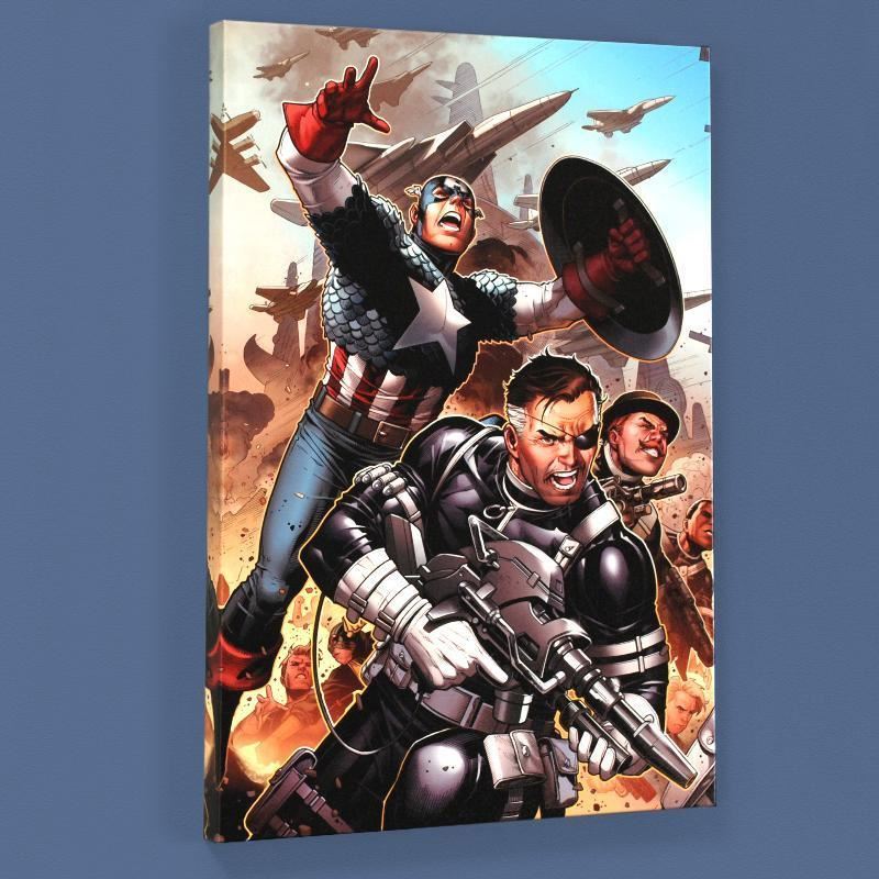 A piece of comic book history, this limited edition, from original art by Jim Cheung, depicts the classic characters Nick Fury and Captain America. Jim Cheung was named as one of 2005's "Young Guns" by Marvel Editor-in-Chief Joe Quesada, and has been described as a "future superstar penciller." "Secret Warriors #18" is a limited edition numbered giclee on canvas by Jim Cheung presented by Marvel Comics. This piece comes gallery wrapped. Includes Certificate of Authenticity! Measures approx. 18" x 27" (image).