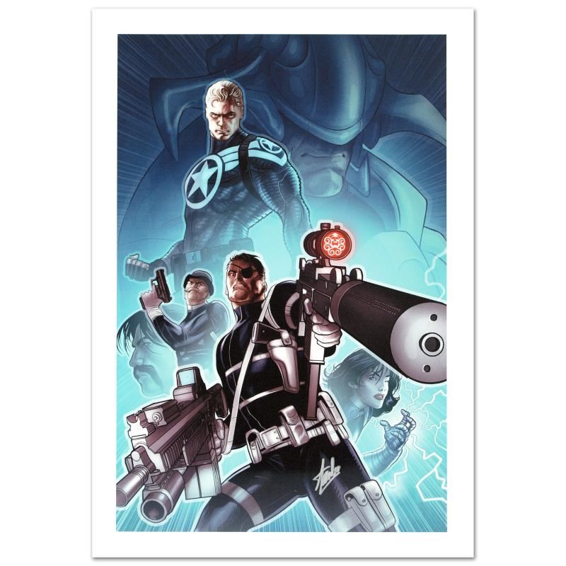 A piece of comic book history, this limited edition, from original art by Paul Renaud, depicts Nick Fury, Dum Dum and Steve Rogers as Captain America. Paul Renaud is a French comic book who has done notable work and been recognized through U.S. publishers including Basement Comics, Image, and Dynamite Entertainment. Paul's most recognized works are on Cavewoman and Red Sonja. Paul has been recognized as a highly capable cover artist, working on a plethora of covers for Dynamite and a handful of covers and even interior pages for Marvel Comics. "Secret Warriors #8" is a limited edition giclee on canvas by Paul Renaud presented by Marvel Comics, numbered and hand signed by the great Stan Lee! Includes Certificate of Authenticity! Measures approx. 18" x 27" (image).