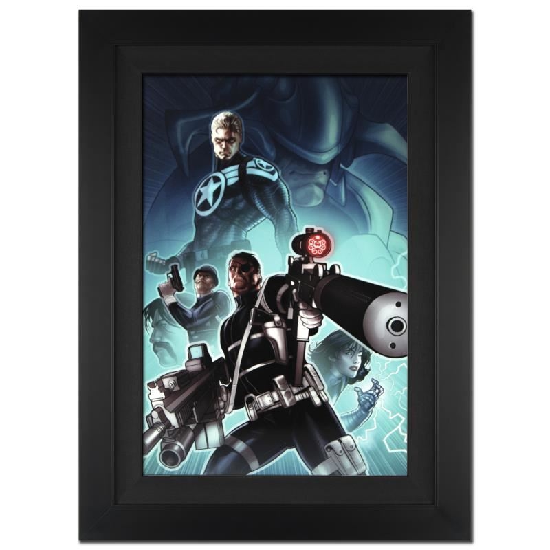 A piece of comic book history, this limited edition, from original art by Paul Renaud, depicts Nick Fury, Dum Dum and Steve Rogers as Captain America. Paul Renaud is a French comic book who has done notable work and been recognized through U.S. publishers including Basement Comics, Image, and Dynamite Entertainment. Paul's most recognized works are on Cavewoman and Red Sonja. Paul has been recognized as a highly capable cover artist, working on a plethora of covers for Dynamite and a handful of covers and even interior pages for Marvel Comics. "Secret Warriors #8" is an extremely limited edition numbered giclee on canvas by Paul Renaud presented by Marvel Comics, hand signed by the great Stan Lee and numbered out of only 10! This piece comes custom framed and ready to hang. Includes Certificate of Authenticity! Measures approx. 25" x 34" (with frame), 18" x 27" (image).