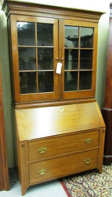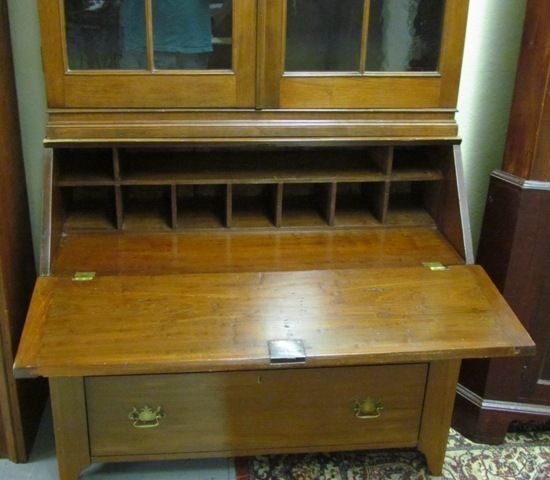 19th Century 2-part Secretary Bookcase. Top with cornice overhand, with 2 six panel glass doors, with original wavy glass , base with drop front writing desk and fitted interior over 2 drawers 80" x 42" x 21"