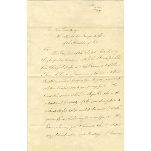 <B> Secretary of State James Buchanan Sends the Credentials of John Randolph Clay to be United States Minister of Peru in 1847</B></I> James Buchanan (1791-1868) Letter Signed as secretary of state, two pages, folio, Department of State, Washington, September 11, 1847. To "<I>The Minister of Foreign Affairs of the Republic of Peru</B></I>" Mint condition. <BR><BR> Buchanan sends a letter of introduction to his Peruvian counterpart, for Minister John Randolph Clay (1808-1885), who was America's first career diplomat. He served in Peru from 1847-1860. Previously, he had been employed in various diplomatic capacities in Russia (1830-1837), Austria (1838-1845), and Russian again (1845-47). At the outbreak of the Civil War, Clay, a Virginian, moved to England, returning only once in 1865, and living there until his death. <BR><BR> Buchanan writes of Clay in part, "<I>...he knows the concern which our Republic takes in the interest and prosperity of Peru, our strong desire to deserve it by all the good offices which may be in our power. He knows, also, my zeal to promote these by whatever may depend upon my Ministry...</B></I>