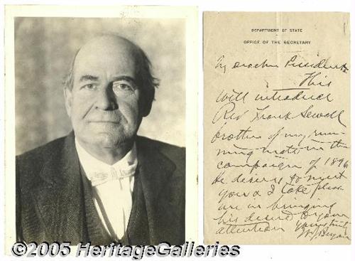 <B>Secretary of State William Jennings Bryan Writes to President Wilson... with Reference to his 1896 Running-mate</B></I> William Jennings Bryan (1860-1925). Democratic candidate for President in 1896, 1900, and 1908. He was defeated in his first two campaigns by William McKinley, in his third by William Howard Taft. Known as the "Great Populist" and hailed for his oratory skills, Bryan distinguished himself as a lawyer and statesman. He served under Woodrow Wilson as Secretary of State but, being a pacifist, stepped down as War approached. It was his battle against Clarence Darrow in the Scopes "Monkey Trial" -- pitting creationist dogma versus Darwinian/evolutionary theory -- that caused his death. It is reported that the grueling battle taxed all of Bryan's strength with a courtroom that often reached 118-degrees in the midday. Autograph letter signed, one page on lettersheet from the "Department of State Office of the Secretary," introducing Rev. Frank Sewall, "brother of my running mate in the campaign of 1896," to President Wilson. Wonderful historical association -- an excellent letter! Together with an original photograph by Brown Brothers of the great orator, 6.5" x 8", imprint on verso. Two items. <I>Accompanied by COA from PSA/DNA.</B></I>