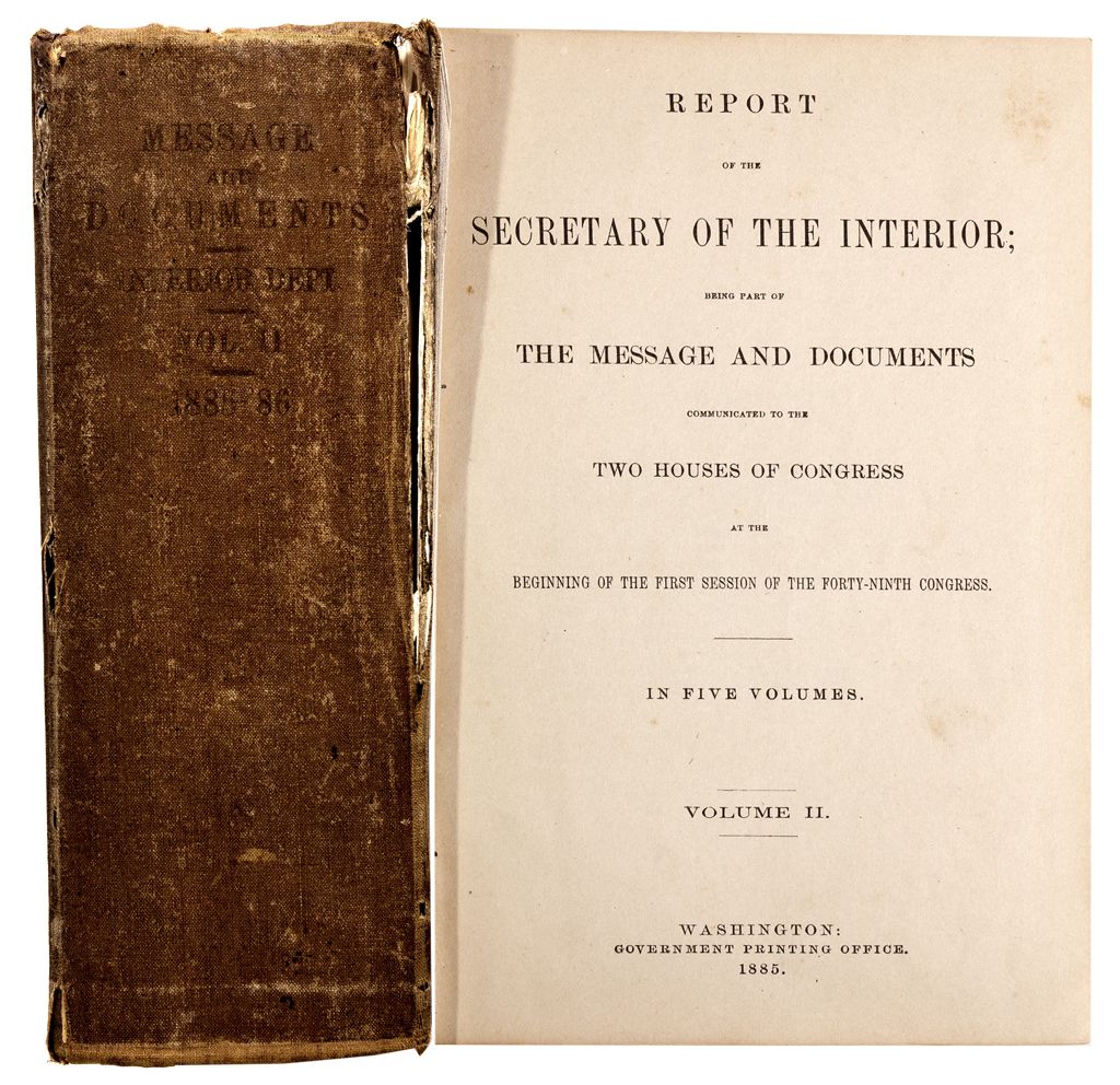 Vol. II includes reports of the Commissioner of Indian Affairs, Superintendents of Yellowstone National Park and Hot Springs Reservation, Utah Commission, and from the governors of Arizona, Alaska, Dakota, Idaho, Montana, New Mexico, Utah, Washington Territory, and Wyoming. From the governor of Wyoming is a supplemental report concerning Chinese labor troubles. Also a report from the Government Directors of the Union Pacific Railway Co. Hardbound in brown cloth. Front cover separating from spine. 1322 pp. 6" x 9".City: County: State: