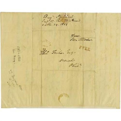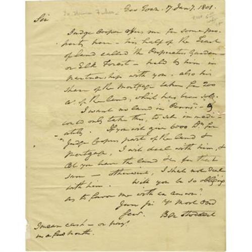 <B>Benjamin Stoddert, First Secretary of the Navy Autograph Letter Signed</B></I> “<I>Ben Stoddert</B></I>”. One page, 7.75” x 10”, Georgetown, January 17, 1801, in ink, to Thomas Fisher, Philadelphia. In this letter Benjamin Stoddert (1751-1813) appears to try and obtain an outstanding debt through the sale of land in Pennsylvania. It reads in part: “<I>Judge Cooper offers me for some property here - his half of the Tract of Land called 'the Proprietors Garden' - or Elk Forest - held by him in partnership with you…I want no land in Pennsa…if you will give 6000 Drs. For Judge Coopers part of the land & Mortgage, I will deal with him…</B></I>”. The letter is complete with franked integral address sheet bearing a Washington postmark. The letter bears the usual fold creases, a bit of paper loss on the integral address leaf (torn at the seal), general toning to the paper, else very good. <I>From the collection of Henry E. Luhrs.</B></I><BR><BR><b>Shipping:</b> Flat Material, Small (<a target="_blank" href="http://www.heritageauctions.com/common/shipping.php">view shipping information</a>)
