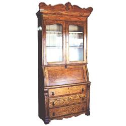 Secretary w/bookcase or china display top, center desk & 3 drawers on bottom, oak, fancy crown, tear