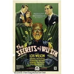 <B>Secrets of Wu Sin (Chesterfield, 1932)</B></I> One Sheet (27" X 41"). Cool graphics, in the vein of many Charlie Chan and Chandu pictures, grace this spectacular sheet from Chesterfield Pictures. In this thriller, a murder mystery brings the police into a case about smuggling Chinese workers into America. Grant Withers and Lois Wilson star. The poster shows quite a bit of border wear including chips out of the lower left and left corner of the one sheet, a 2 inch tear on the right and light smudging. We've never seen this poster before and certainly must be rare. Fine+.
