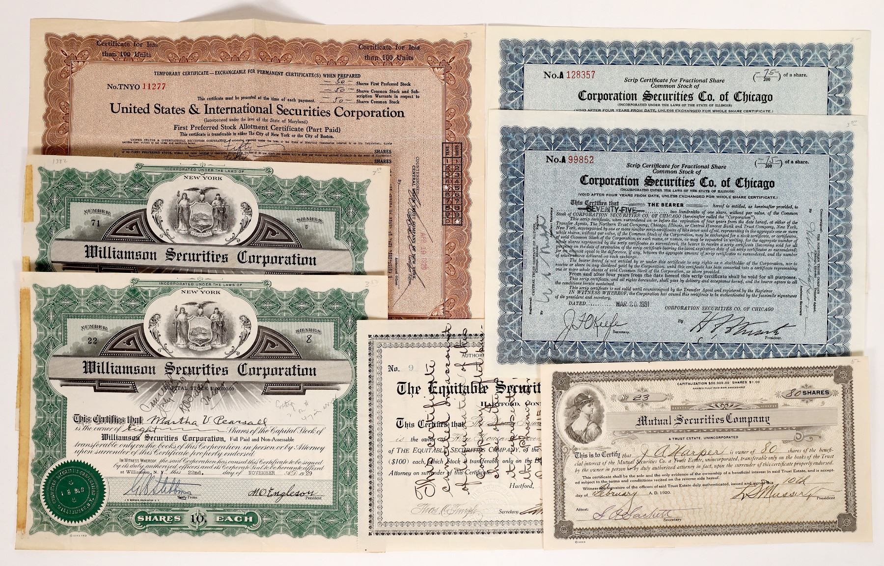 7 securities stocks, c. 1915-49. 2x Williamson, 2x Corporation Securities of Chicago, Mutual Securities, U S & Intl Securities, Equitable Securities.