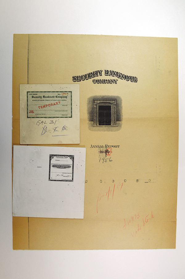 Large plate proof from 1955 Annual Report cover with changes for 1956. Two different sizes of Employee identification card. 3 intaglio prints. Great internal use documents. As made.