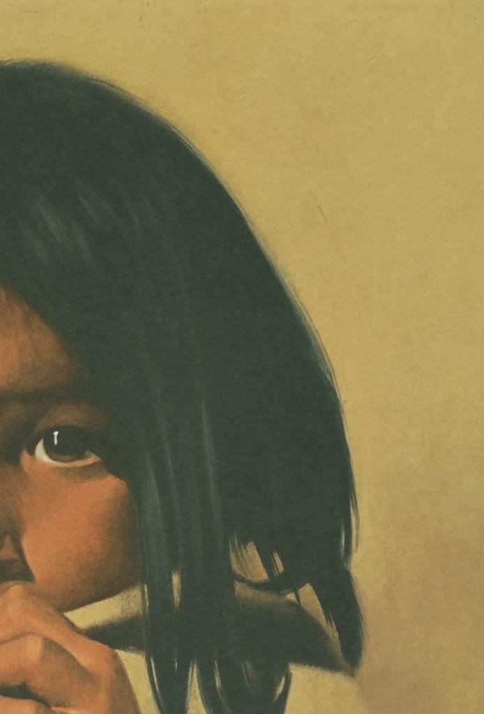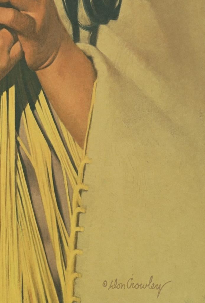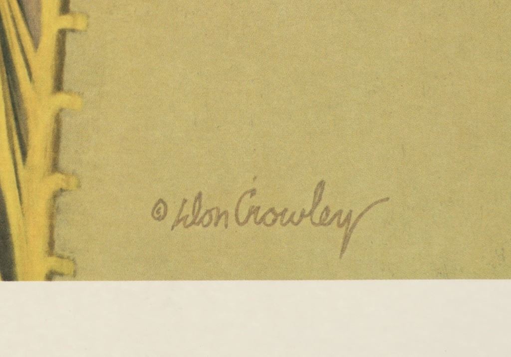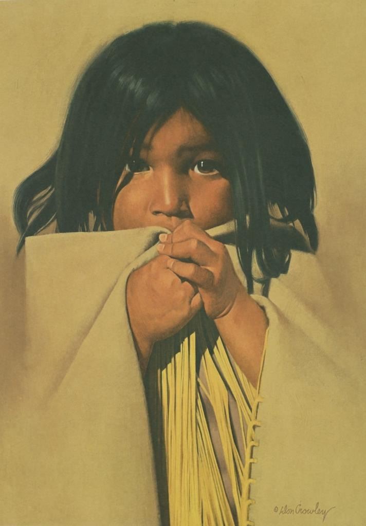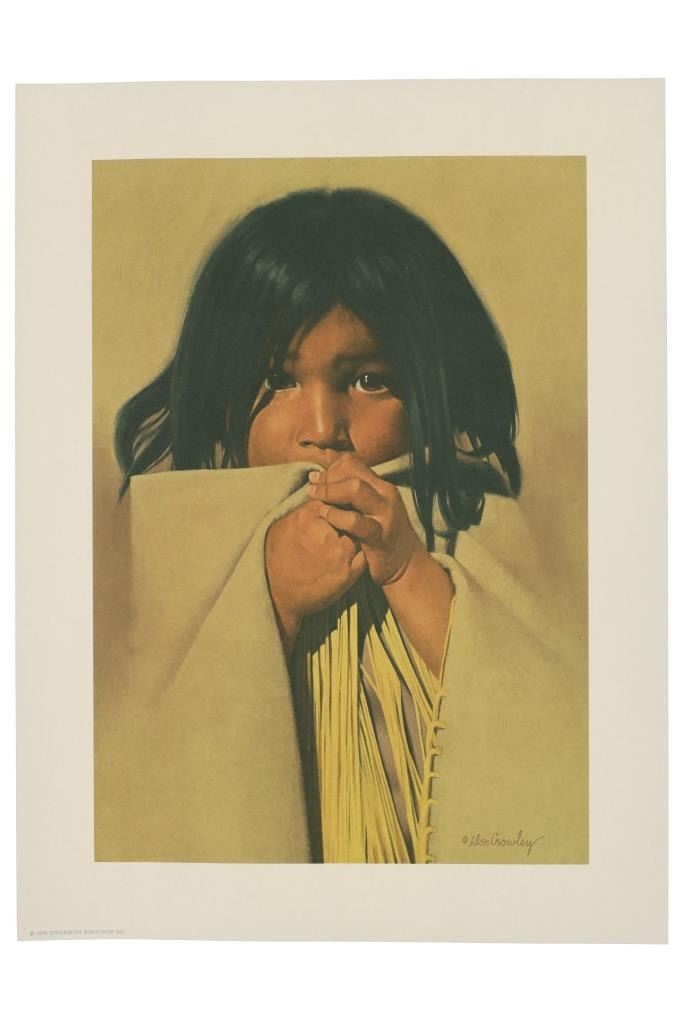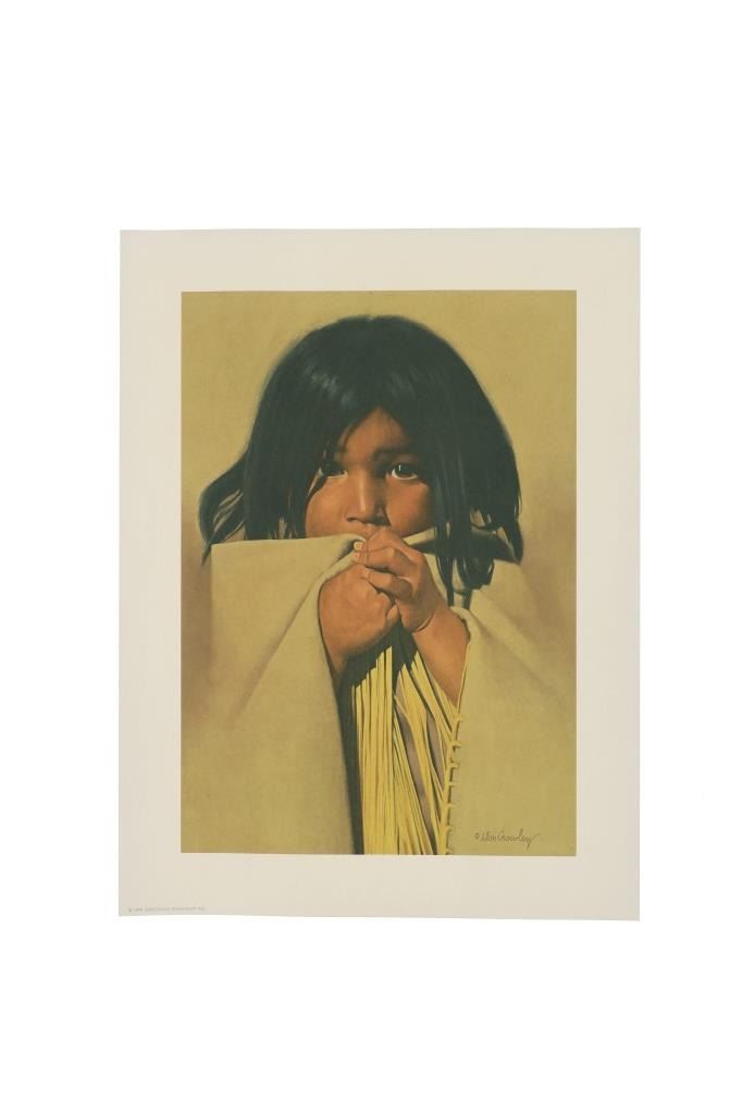 This lot includes a Don V. Crowley print, "Security Blanket." Don V. (Donald) Crowley (1926 - 2019) was known for his Historical-Indian genre and animal paintings, and illustrations. Crowley was heavily influenced towards subjects and technique by Frederic Remington's book titled, Done in the Open. He went to Tucson in 1973, with the idea of painting exclusively for galleries and moved there permanently the next year. His models were often members of the San Carlos Indian Reservation in eastern Arizona and eventually, almost exclusively, a family of Paiutes, the Martineaus, from the Kaibab Plateau region of northern Arizona. His handsome, clear portraits of Native American women and children and their colorful Pendleton blankets are signature works. In fact, long-time collectors of his work may see the subject as both a girl and a woman, wearing the colorful, geometrically patterned blanket that is handed down from generation to generation. He is a member of the “Tucson 7,” an informal group of artists who all began their careers in commercial art and illustration and have made the successful transition to Western fine art. In 1994, he was elected a member of the Cowboy Artists of America, a group devoted to keeping realistic Western art alive in the tradition of Remington and Russell. This prestigious group holds its annual exhibition and sale each October at the Phoenix Art Museum. Crowley is represented by some of the most prestigious western art galleries in the country including Settlers West (Tucson, AZ), Trailside (Scottsdale, AZ; Jackson Hole, WY) and Alterniann (Santa Fe, NM). The eloquence of a Don Crowley painting is not in its re-creation of history, but in its vision of the living. A consummate realist, Don can paint the beauty and dignity of an Apache maiden, the spiritual countenance of an Indian dancer or a quiet still life with equal skill and passion. He has been able to free his talents and delve into the engrossing world of the Apache and Paiute Indians. His paintings typify the ideals of these southwestern societies and impart to the viewer the serenity of these people and their surrounding. Published by The Greenwich Workshop in 1979, this print is in very fine condition, no marring observed. Measures 19.5"L x 16.5"W.*