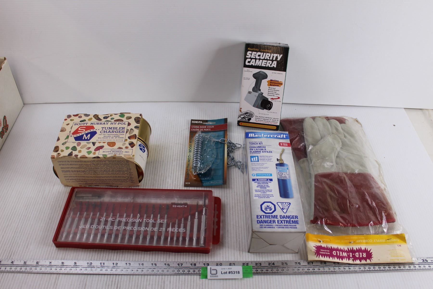 Security Camera+ Work Gloves+ Tumbler Charges Polish+ Storm Door Chain + Torch Kit + 21-PC. Precision Tool Set