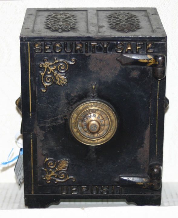 Miniature Security Safe – Works on combination that comes with safe. Open door to reveal three drawers. Raised decorations on front, sides, back , & top. Lion heads hold ring handles on each side. Wear on front door, but other sides show less wear. Measures approx. 8”H x 6” W x 5” D.