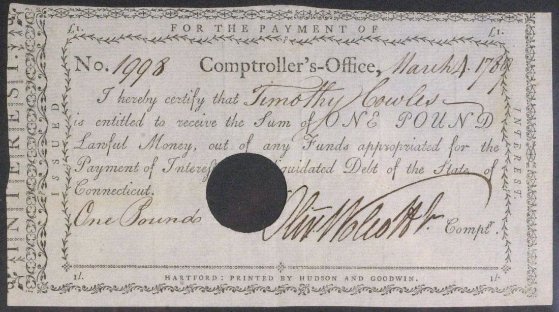 Oliver Wolcott, Jr. (1760-1833) Politician. Wolcott was United States Secretary of the Treasury from 1795 to 1800 and governor of Connecticut from 1817 to 1827. 6 ½†x 3 ½†partially printed document signed, Connecticut, March 4, 1787. The document is a pay order directing the payment of one pound to Timothy Cowles. The circular cancellation hole barely touches the beginning of the signature.