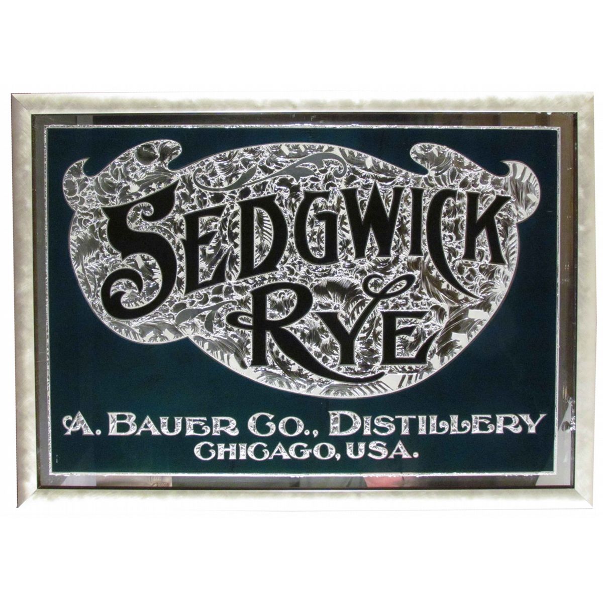 Sedgwick Rye Reverse Glass Sign. A. Bauer Co. Distillery, Chicago. Glue chip process. Attributed to Western Sandblasting Chicago. Mint condition. 28 X 20 inches.