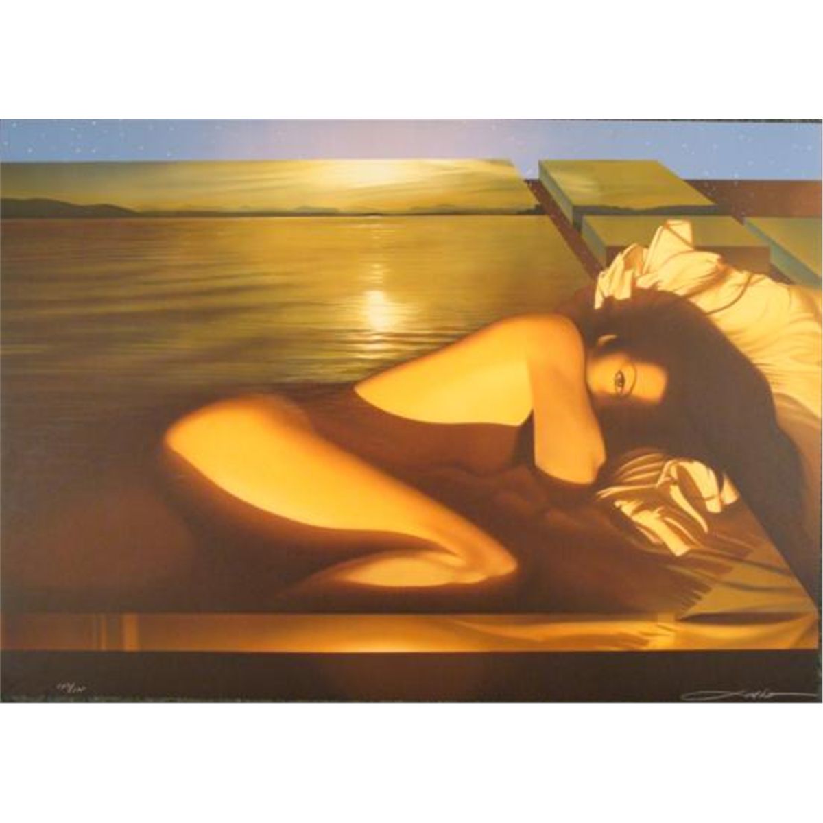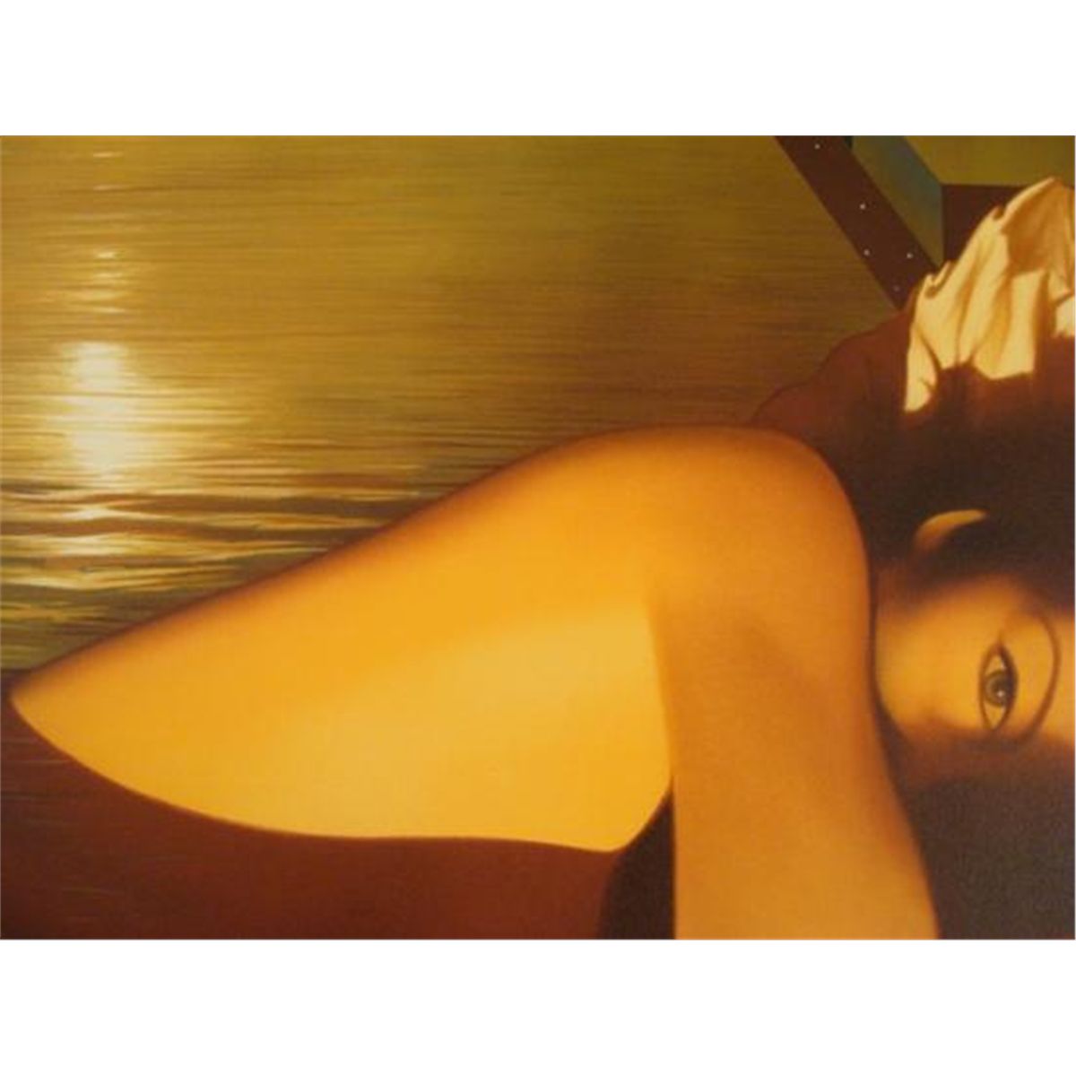 This inviting print is by popular and highly prized artist Frank Licsko (Hungary, b. 1946): * Title: "Spellbound" * Serigraph on paper * 25 × 36 * Signed by the artist in pencil LR * Numbered from a limited edition of 175 LL * Excellent condition; never mounted, matted or framed * Certificate of Authenticity issued by Midwest Estate Buyers * * One online gallery representing Licsko has this to say: "Licsko's work takes one in to an abstract world, a peculiarly and powerfully beguiling world, a world which combines much of the mathematical intrigue of Escher, the haunting surrealism of the early Dali, and the structural mysticism of the mandala." * * The highly prized and praised work of Frank Licsko has been shown in many exhibitions and solo shows throughout the world. * * * SPECIAL SHIPPING NOTE: This print will be shipped rolled in a heavy duty mailing tube.