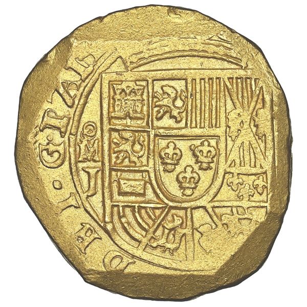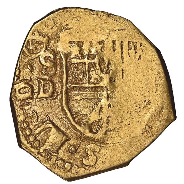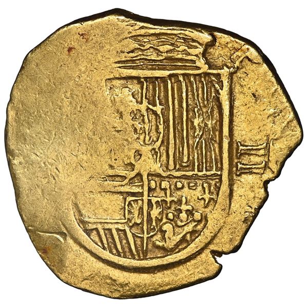 Seville, Spain, gold cob 2 escudos, Philip IV, assayer not visible. Cal-Type 388. 6.45 grams. Bold and full but off-center shield with equally bold (P
