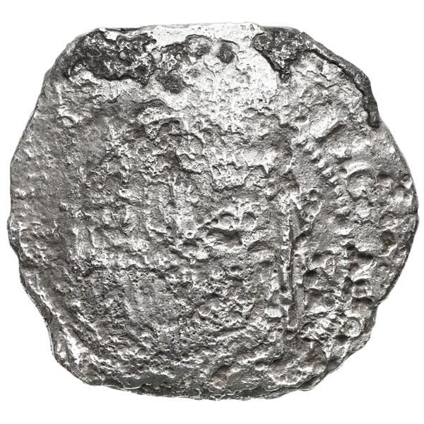Potosi, Bolivia, cob 8 reales, Philip II, assayer B (4th period), Grade 2. S-P12; KM-5.1. 25.45 grams. Well-detailed full shield and cross despite mod