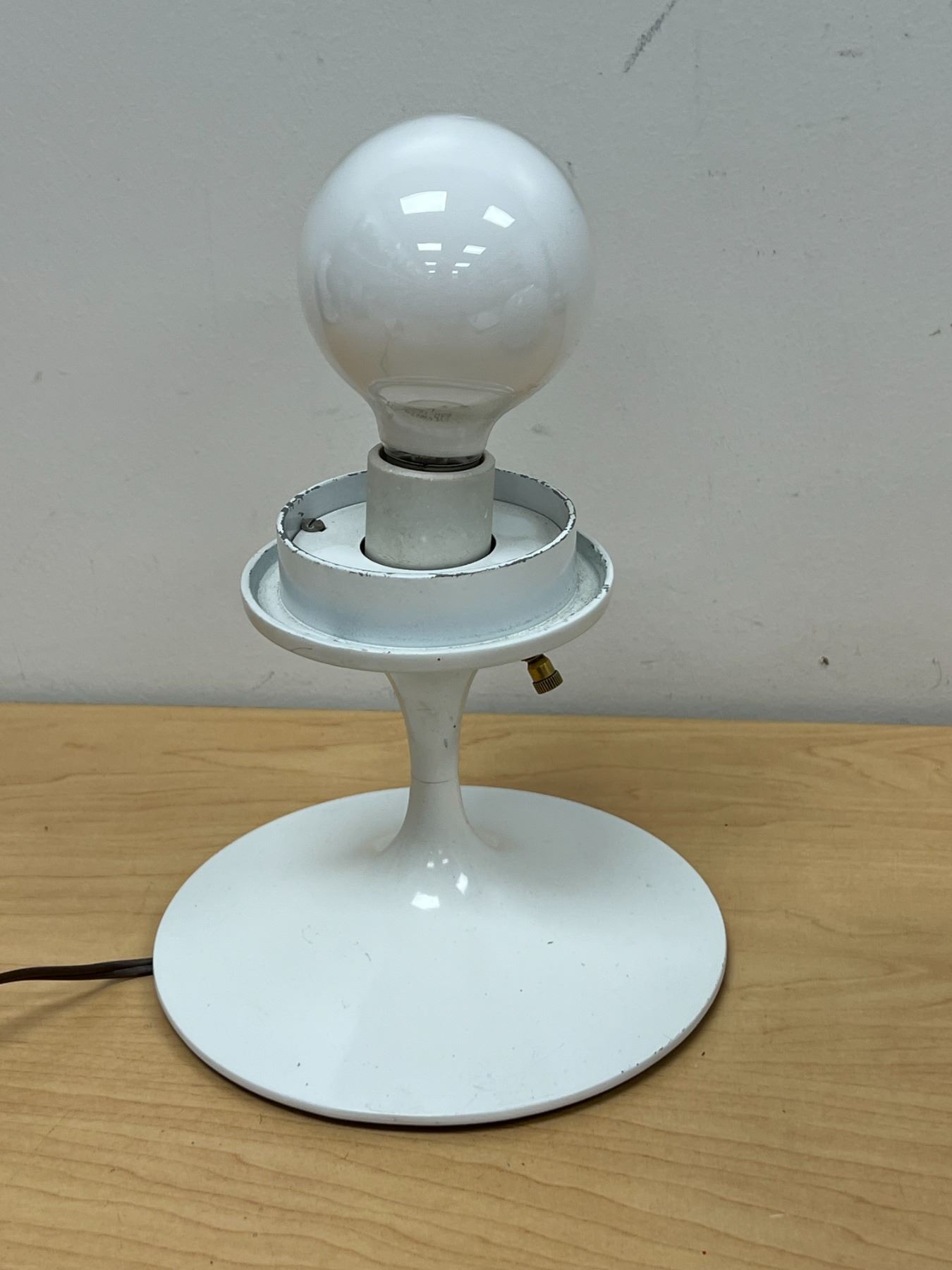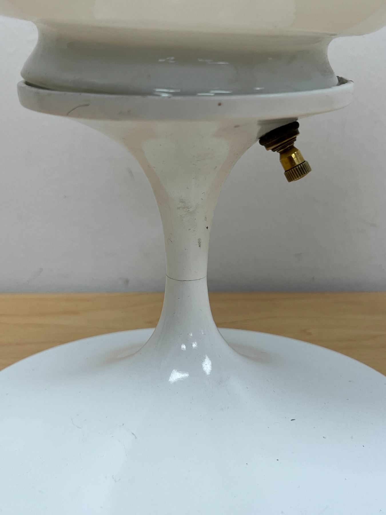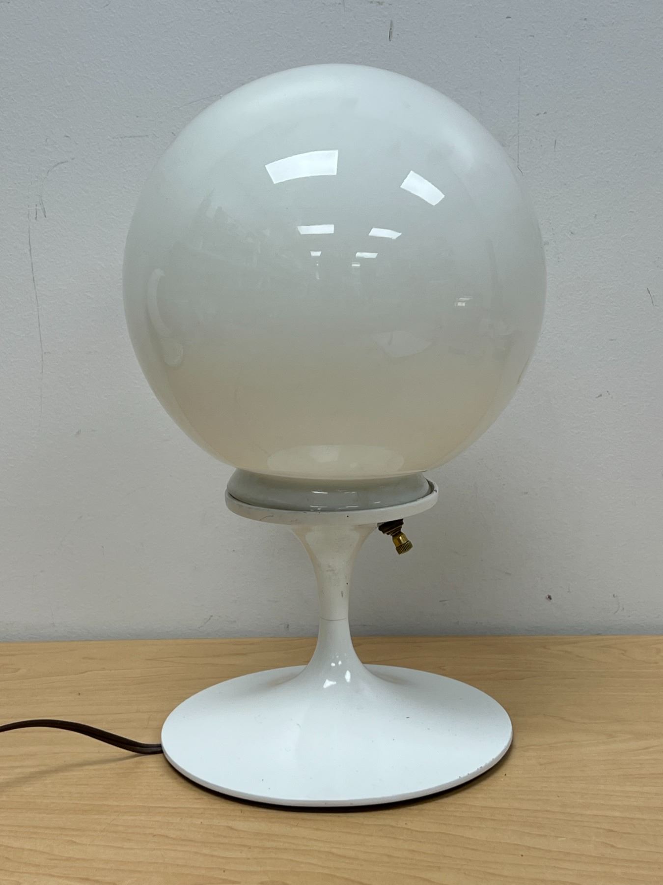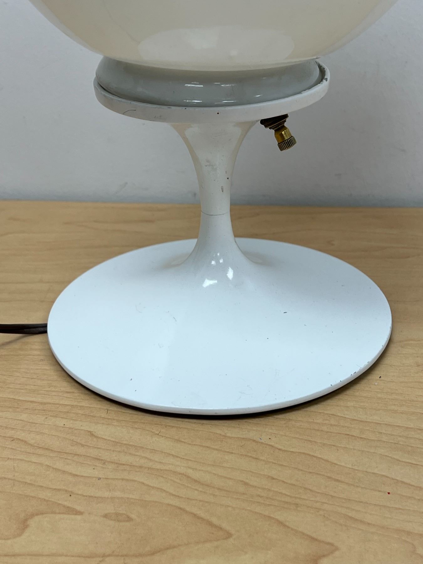 See Description: Mid Century Cast Metal Tulip Base Table Lamp With Globe. The Globe is not original and doesn't fit properly. This lamp most likely uses a non-standard globe and may be difficult to source. As pictured, it's about 12.5" tall with globe. Base is about 7"; please see all photos.