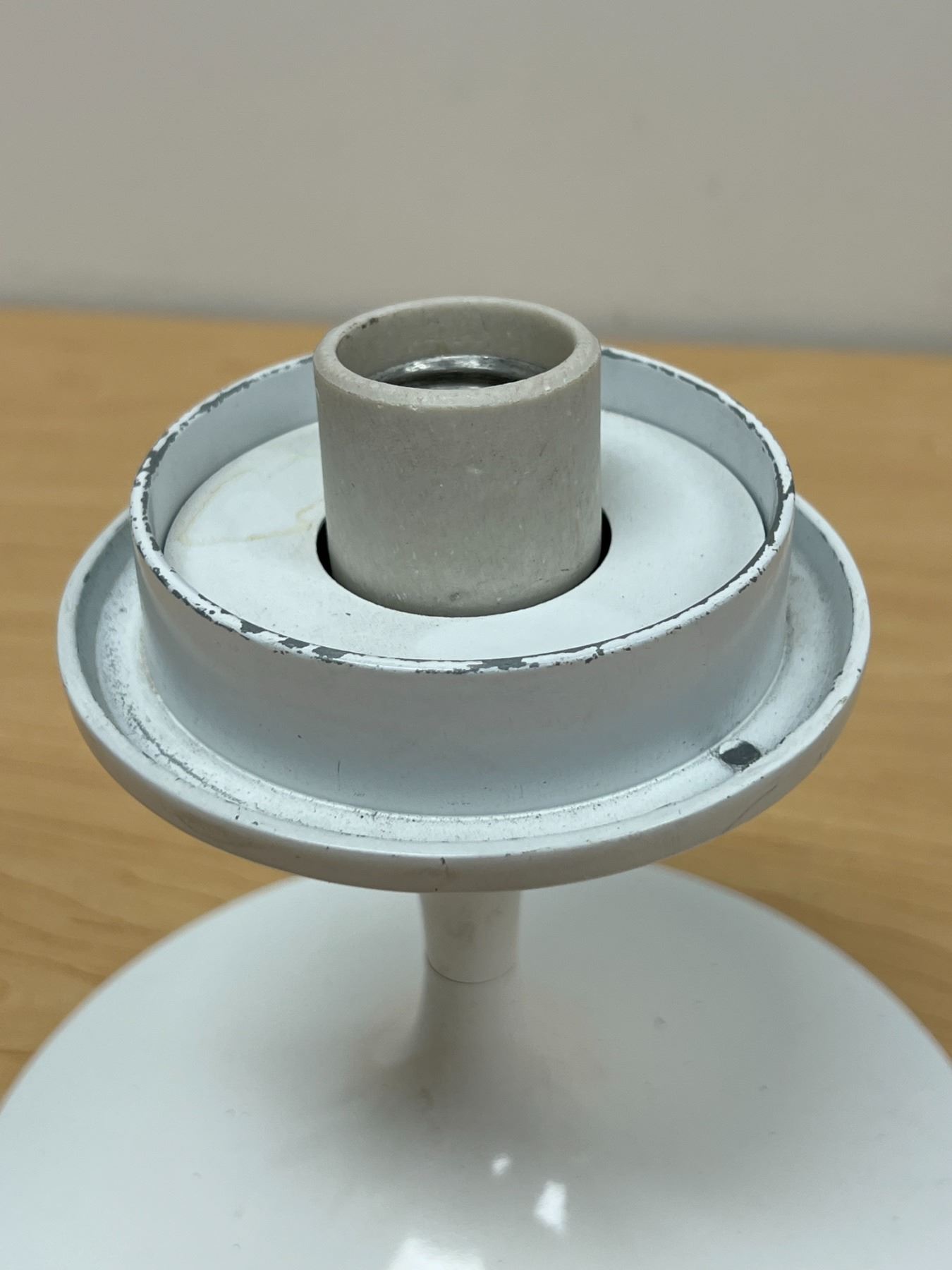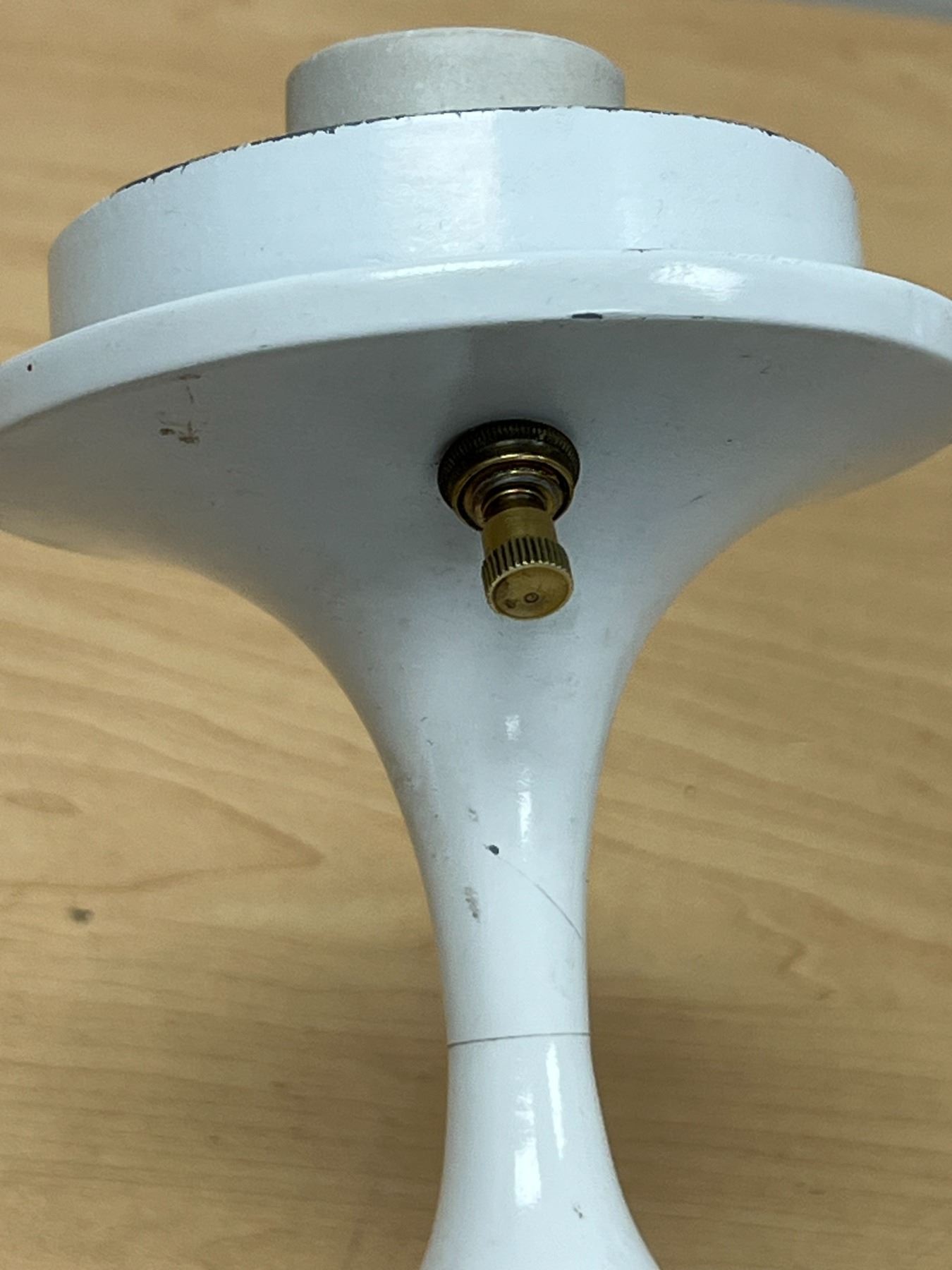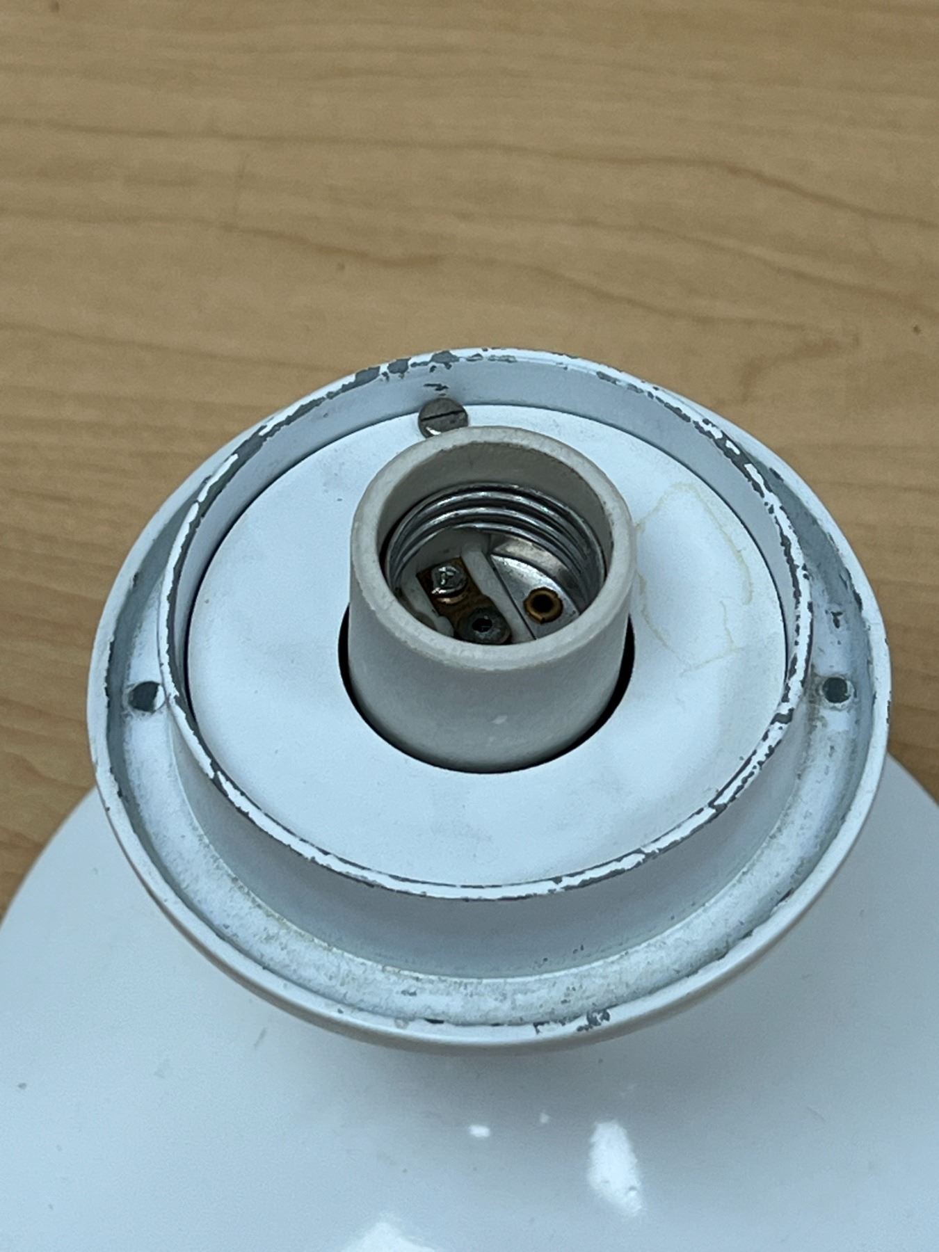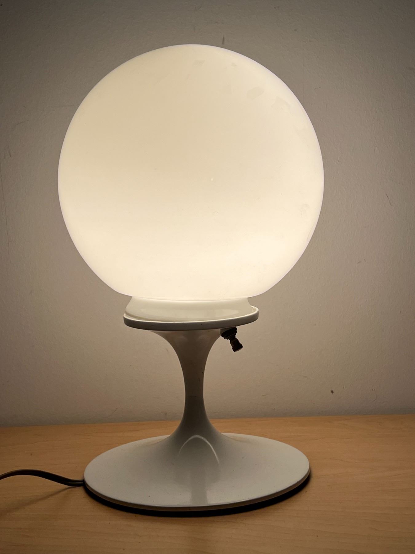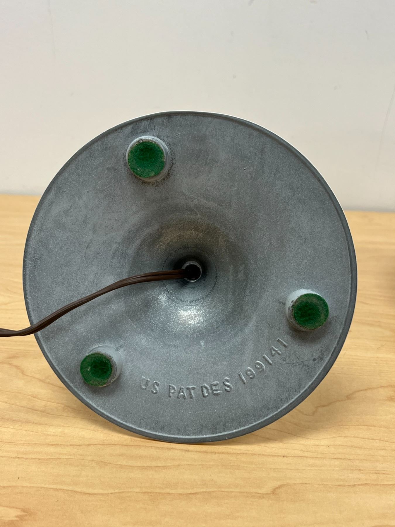 See Description: Mid Century Cast Metal Tulip Base Table Lamp With Globe. The Globe is not original and doesn't fit properly. This lamp most likely uses a non-standard globe and may be difficult to source. As pictured, it's about 12.5" tall with globe. Base is about 7"; please see all photos.