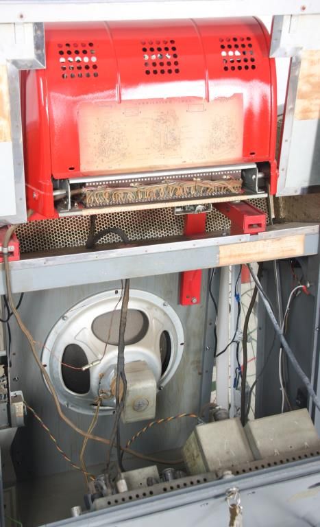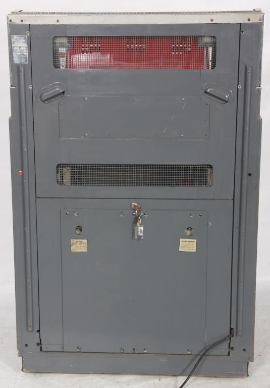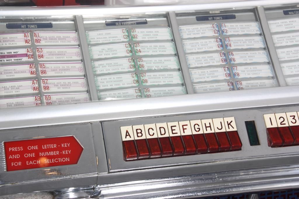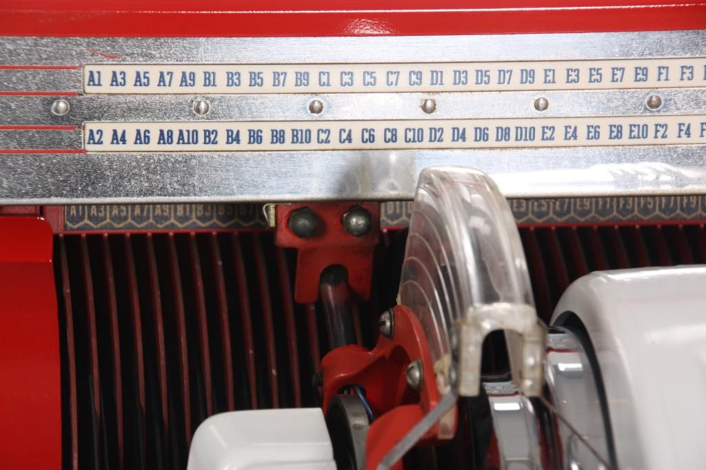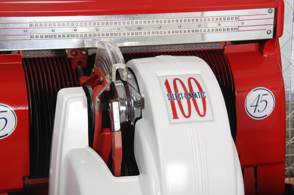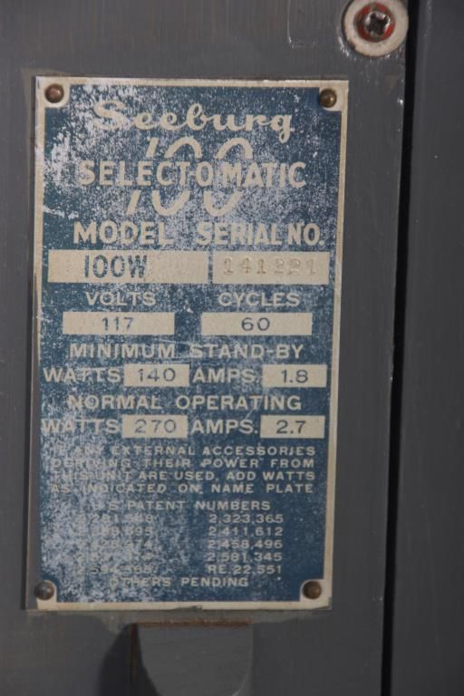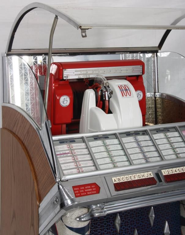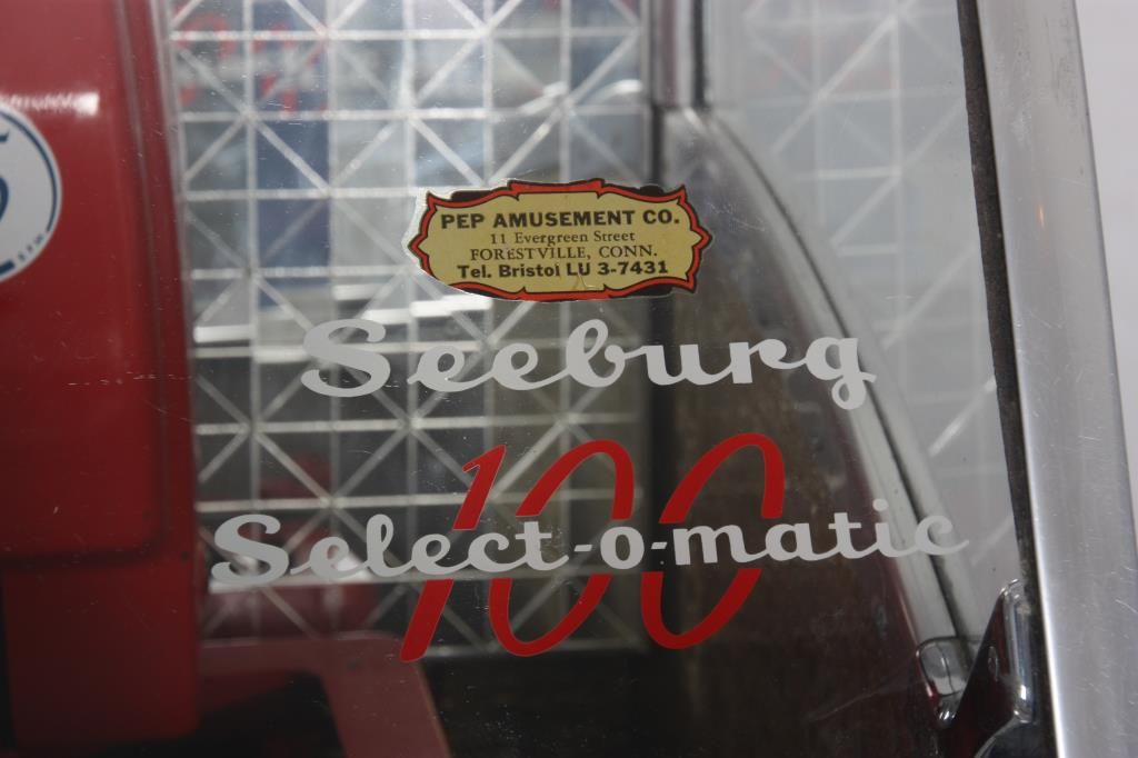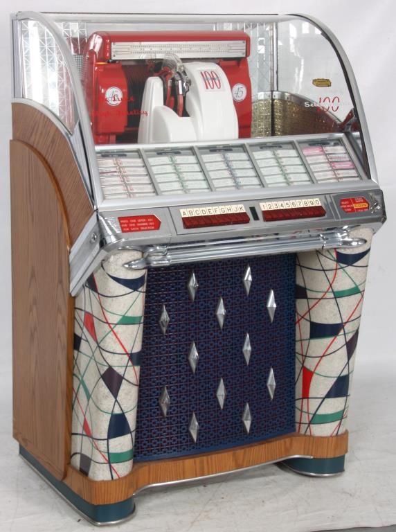 Seeburg Model 100W Jukebox - 1953. The large curved glass front lid exposes the working mechanics to the Select-O-Matic 100, playing 45’s, has red and white painted covers and a mosaic mirror tiled back and chromed trim around the glowing red push button selectors; tapered colorful light up plastics on the corners and wood veneered case. Signed on a metal tag on the back Seeburg Select-O-Matic 100 with model number 100W and serial number 141221. Good working condition. 53 in. high x 35 in. wide x 26 in. deep.
