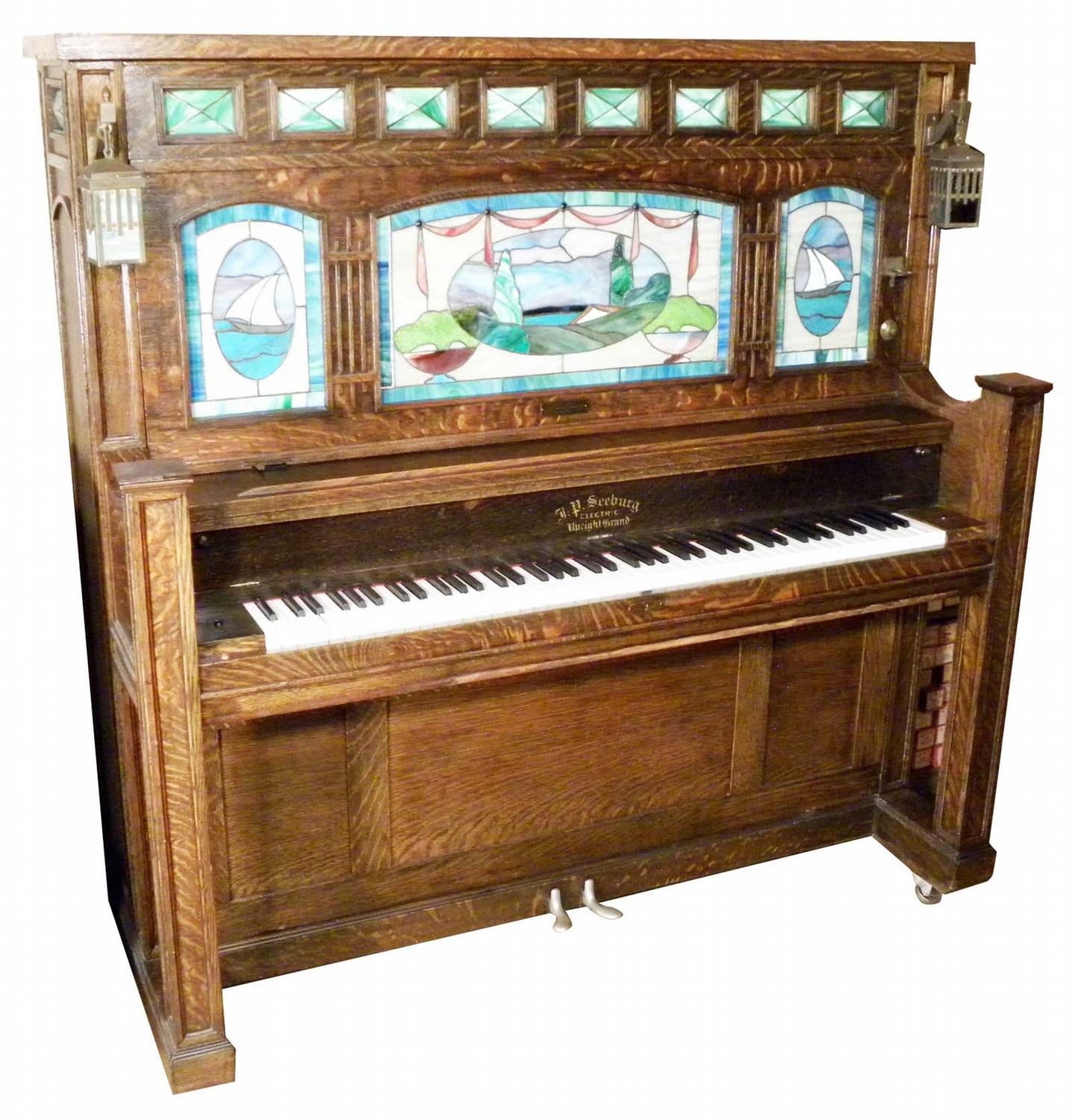 Seeburg Model "F" Nickelodeon. J.P. Seeburg Upright Electric Grand. Quarter sawn oak cabinet with beautiful art glass front and hanging slag glass lamps. 32 flute pipes with keyboard. Plays 10 tune, "A" rolls. Good working condition. 64 X 65 X 28 1/2 inches.