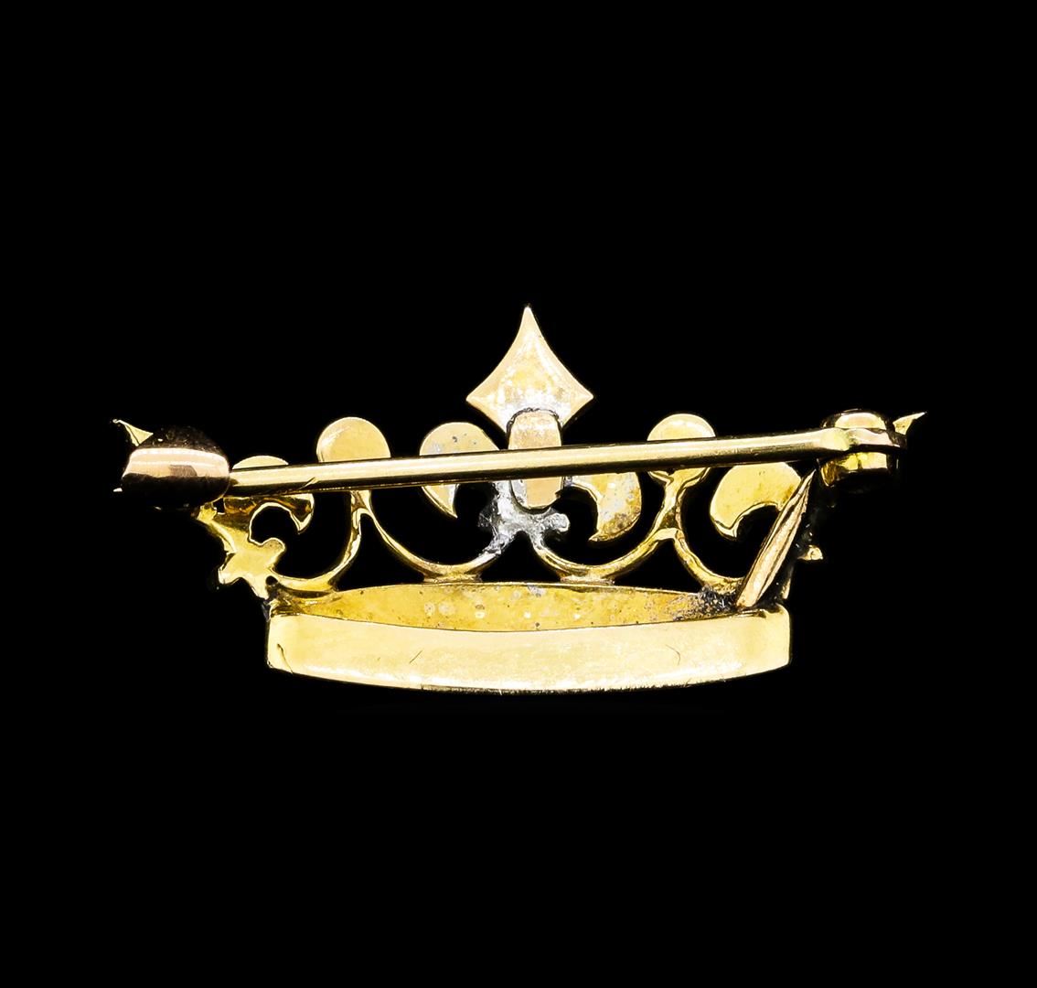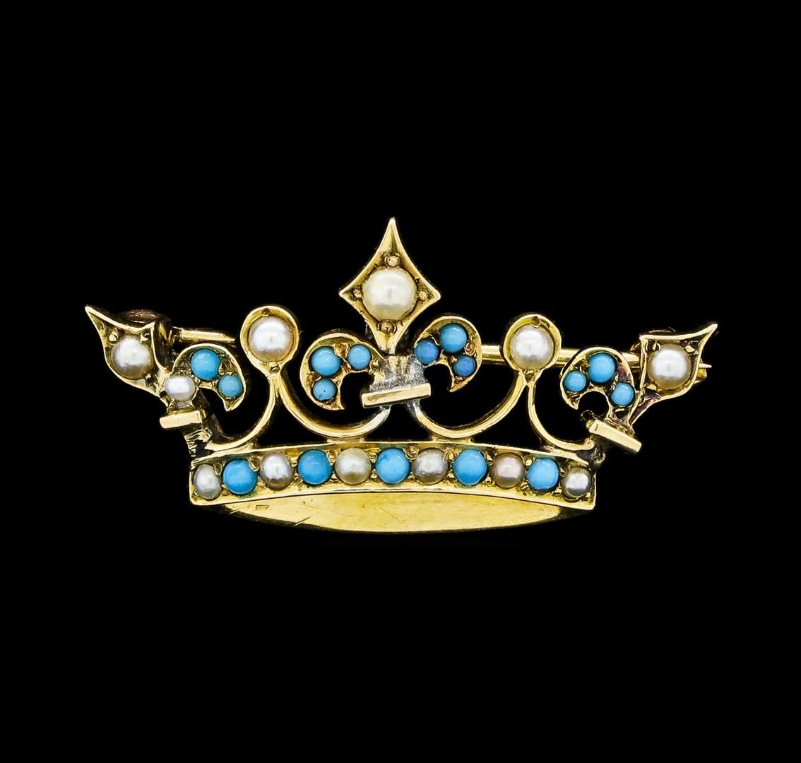 One lady's crown motif pin featuring: 9KT yellow gold weighing 2.5 grams containing twelve seed pearls and sixteen round cabochon turqouise.