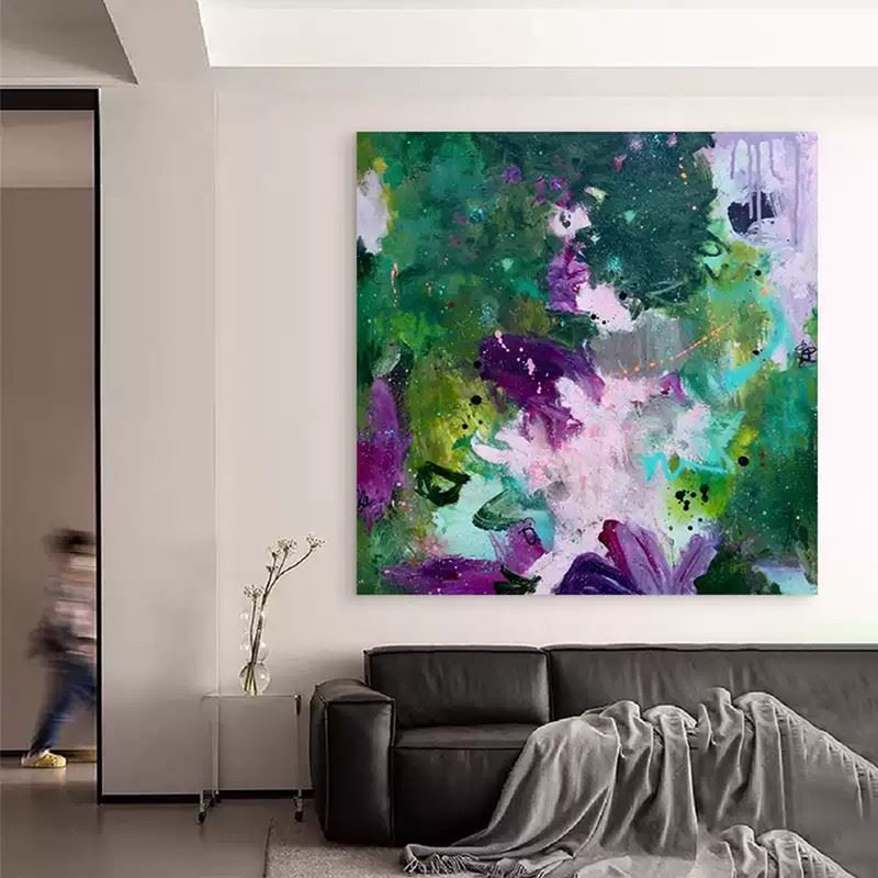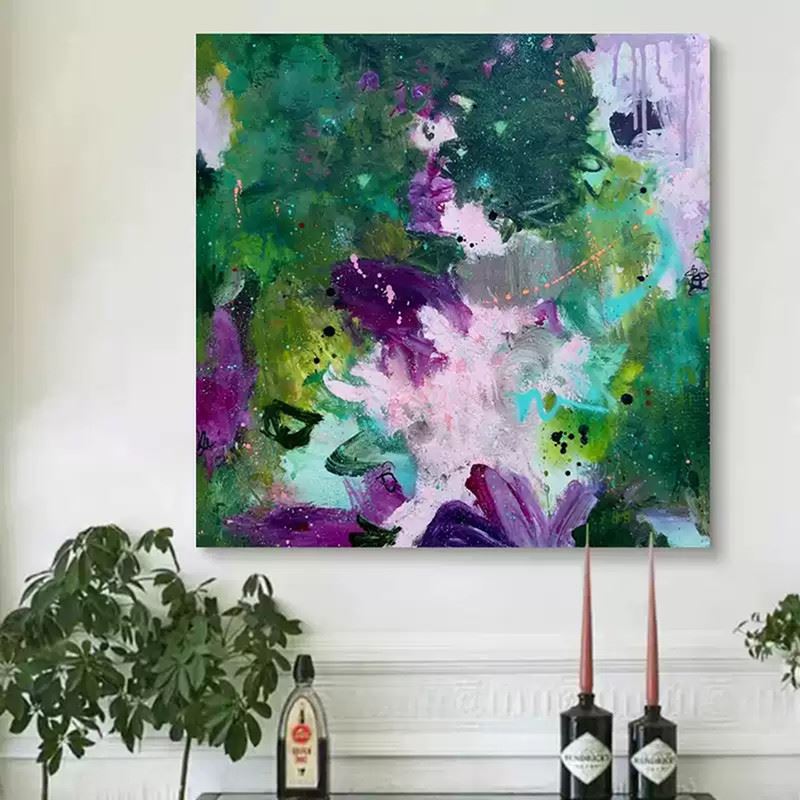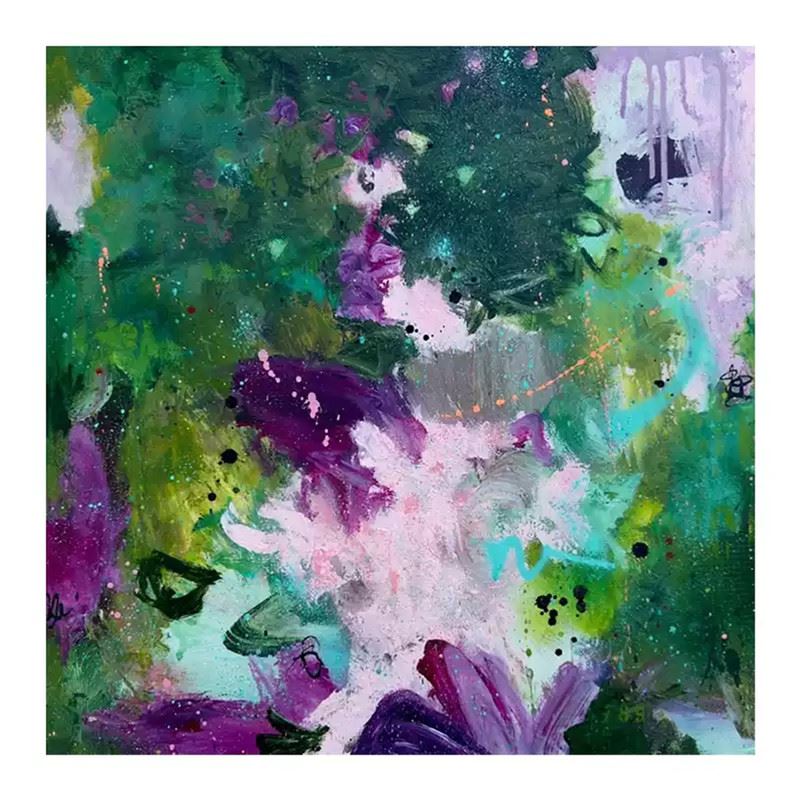 Deep greens bleed across the canvas, broken by bursts of pink, violet, and luminous teal, like ink slowly seeping through paper, turning a single emotion into an abstract, overgrown garden. Dimensions: 24 x 24 inches.