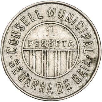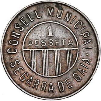 Segarra de Gaiá. 1 peseta (cuproníquel), 1 peseta (cobre) y 1 peseta (latón). S/F. Serie completa. VII-268, 269 y 270. MBC/MBC+.