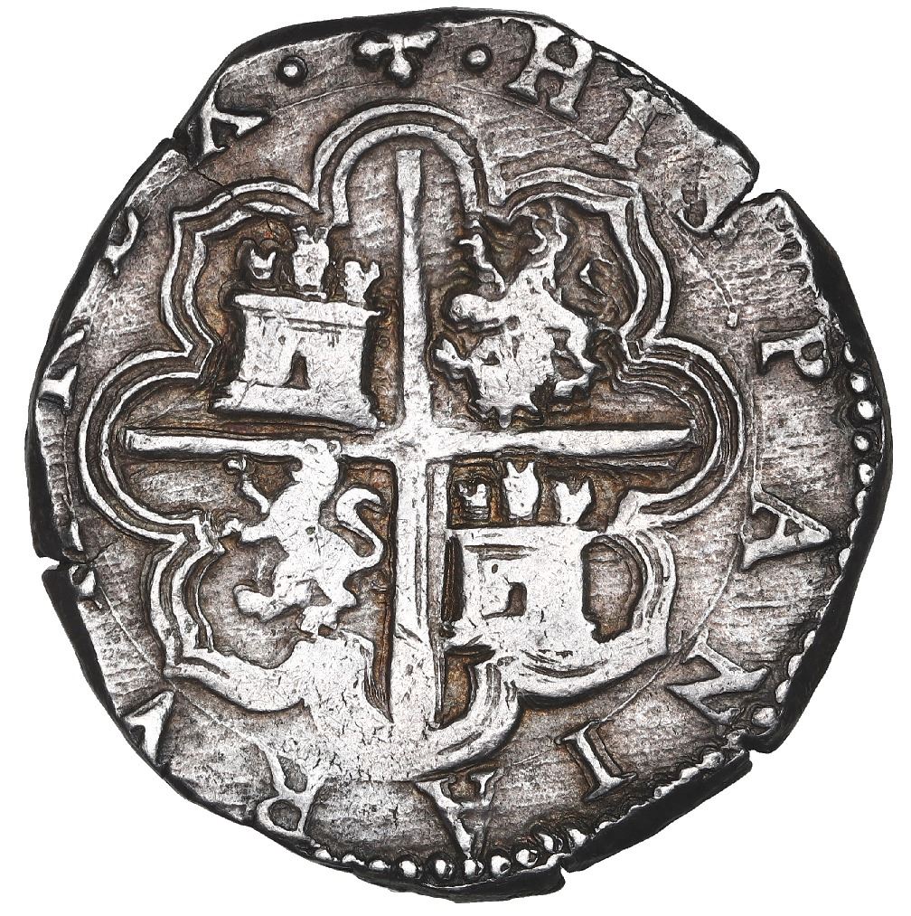 Segovia, Spain, cob 2 reales, Philip II, mintmark aqueduct over denomination II to left, assayer oD to right, Calico Plate. Cal-374. 6.88 grams. XF with attractive steely toning all over, full crown and nearly full legends, choice full (well-detailed) shield and cross, very small edge-splits. Plate Coin #512 on p. 217 of the 2008 edition of Calico's Numismatica espanola.